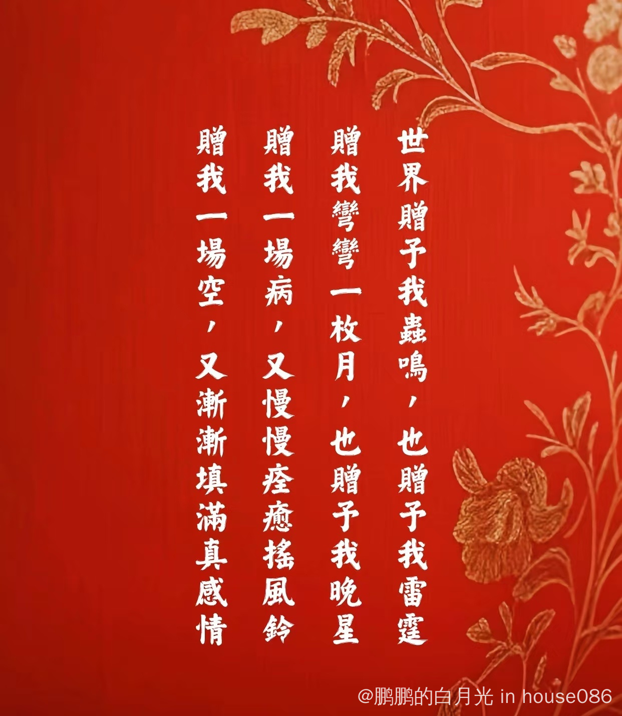 站在2025的春天,收拾一下零乱的生活,调整一下偏位的心态,放下该放下的包袱,忘记该忘记的忧虑,释怀该释怀的心结。就像《世界赠予我的》深层的含义:虫鸣是宁静,雷霆是动荡,一场病是痛苦,痊愈的风铃是治愈,拥有是内在的充盈,回敬是对外的力量,名是名相,年龄是无常,窗是出口,屋顶是盖障,诗是梦幻,安静读取是自然规律流淌。这是修行的意境。