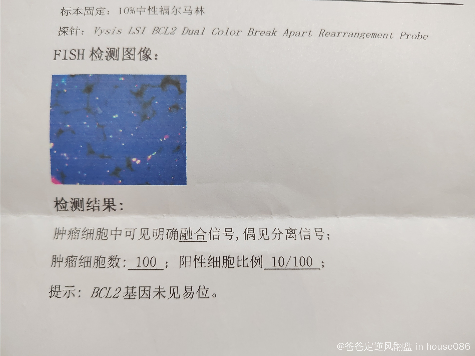 | 之前免疫组化结果出的时候,根据医生的建议做了bcl 2以及bcl 6的fish检测,但是等待fish结果期间看到双打击,三打击什么的又开始焦虑,是不是漏做了一项cmyc 现在终于fish结果出了,只看到bcl 2未易位,bcl 6没有看到(医生说因为切片取的位置不够,所以看不到),那这样还是排除不了双打击(之前有求助过大家,大神们有说Cmyc免疫组化15%的话,fish应该无易位)