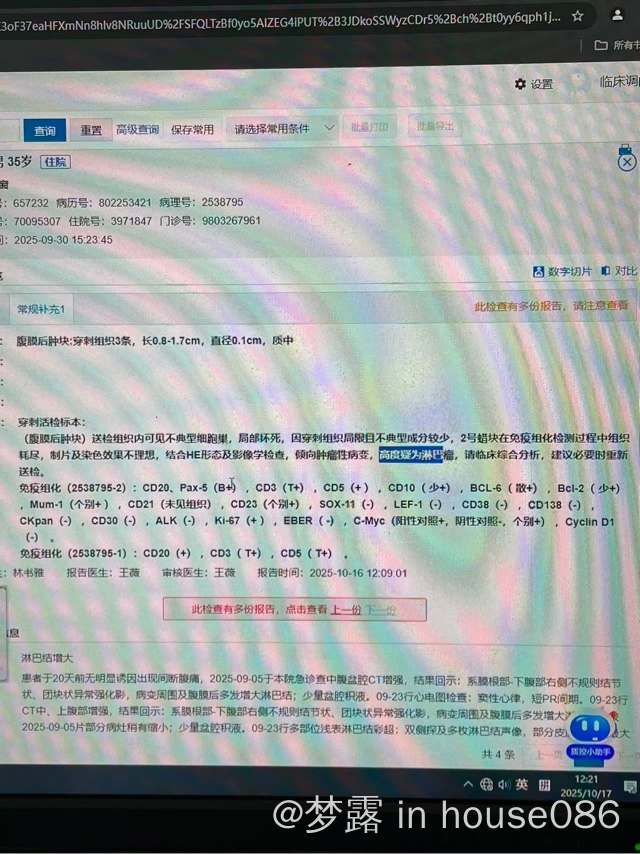 梦露 发表于 2025-10-17 13:44 免疫组化虽然没书面确诊,刚找了医生,告诉我确定就是淋巴瘤了偏向于弥漫大B