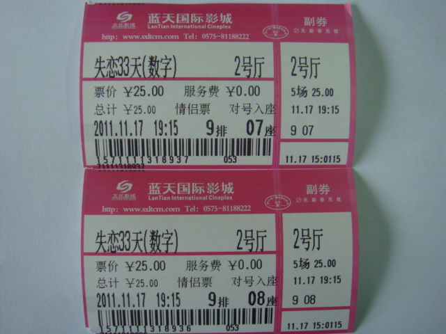 进场之前买爆米花,水和可乐。我觉得我又回到了我们很多年前的恋爱。但是电影一半的时候,我知道你撑不住了,因为身体腹胀,还有小疼痛,离开的时候,你说我们下次还可以来看。是的,没关系。下次再来.在车上,我们一起回忆以前看过几次,其实加这一次,只有三次,正确的说是二次半.第一次在杭州,我去看你.那时候正在谈朋友.第二次我们已经结婚,新房还没有装修,在绍兴看了电影,最后路远没能回到单位宿舍,也算是在外面浪漫了一晚.所有的一切,我都记得,其中两张电影票我都留着,那是我们共同拥有的回忆,一直珍藏着,将来我们还会拥有更多,更多...