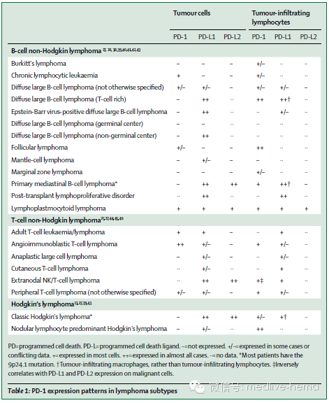PD-1和PD-1在淋巴瘤中表达的大部分数据来自于体外试验或少数不同类型淋巴瘤患者——大型混合患者群的一部分。恶性细胞和肿瘤浸润淋巴细胞可以表达PD-1,PD-L1或两者都表达,依赖于疾病亚型和淋巴瘤微环境的组成。研究之间和患者之间存在大量可变性(表1)。