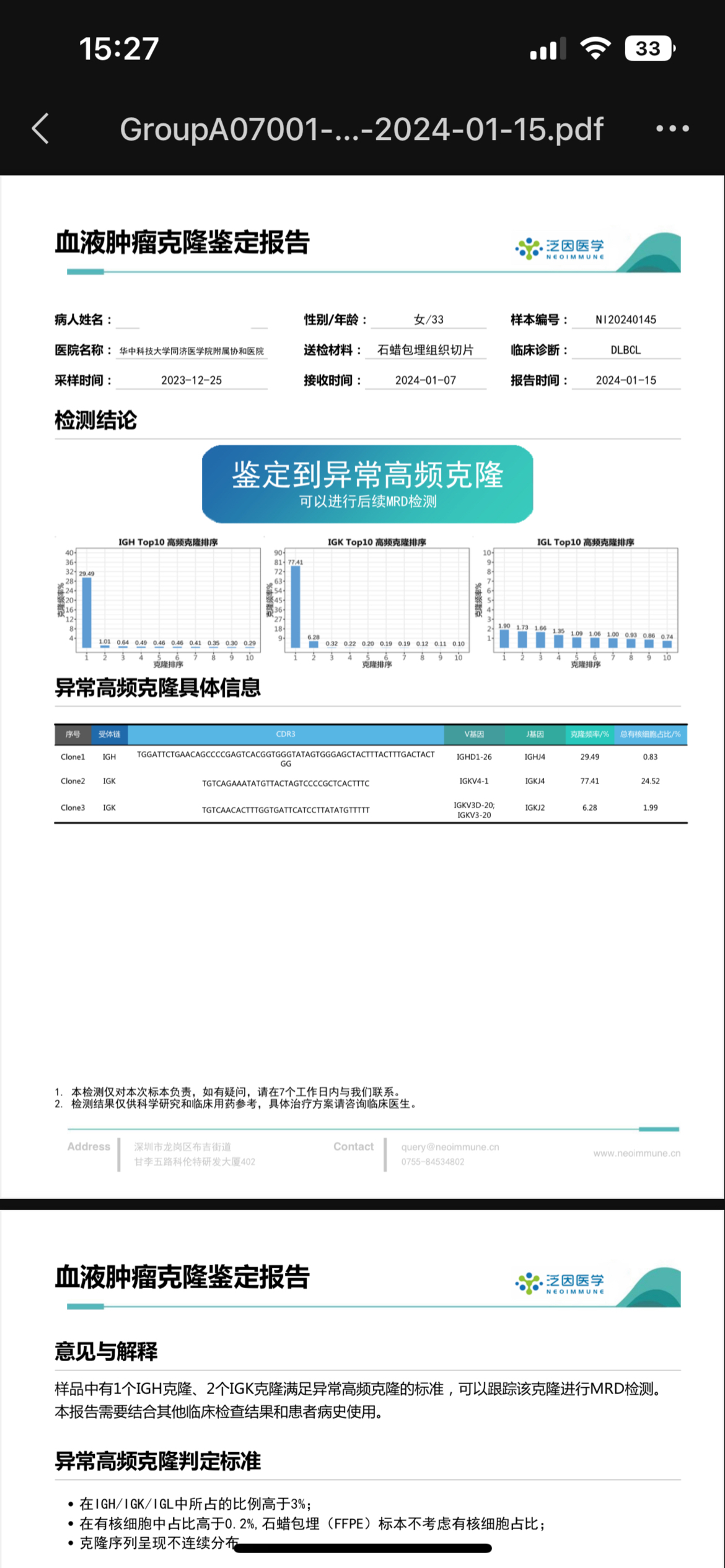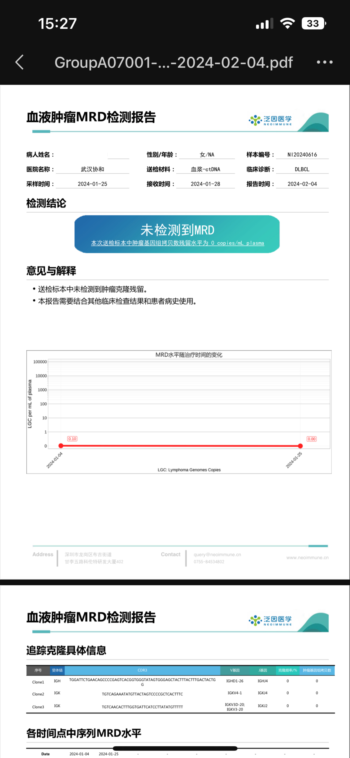 求助,治疗前血液MRD鉴定到异常高频克隆,一疗后未检测到MRD,是不是意味着化疗敏感,效果好呢?