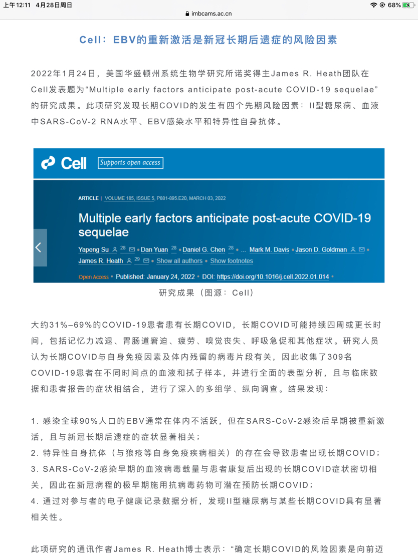Futures 发表于 2024-04-28 09:33 其实想研究肯定是可以的,根据新冠之后三年各大医院血液病人数与新冠前三年对比,根据发病时间,年龄来分,如过青壮年的发病率显著增高了,那就能说明问题了,只是现在还处于进展阶段,需要几年时间的数据累积,而且这东西太敏感了,真有细思极恐的结果对于做研究的人来说是自找麻烦,时代的一粒尘到每个人身上就是一座山