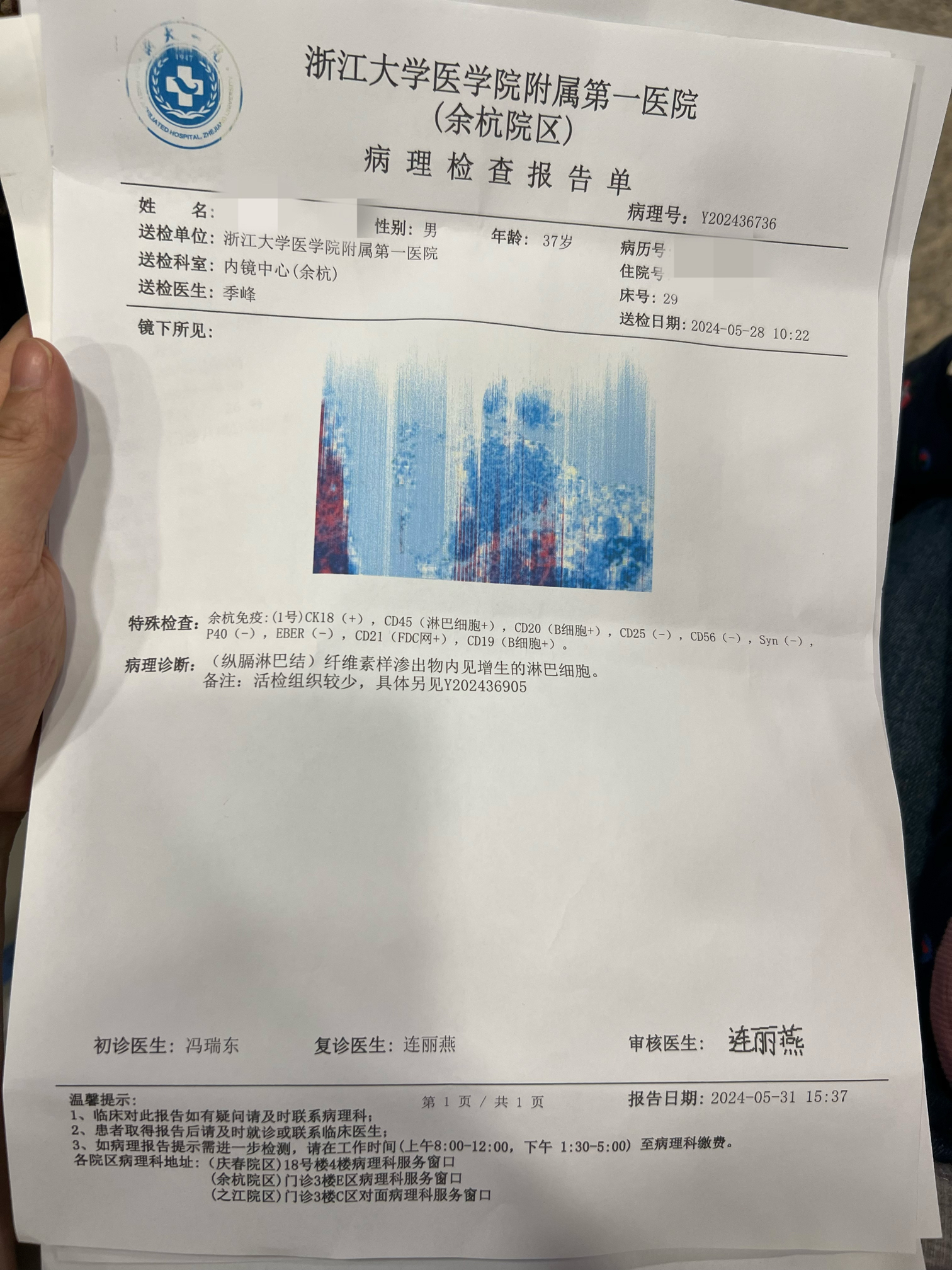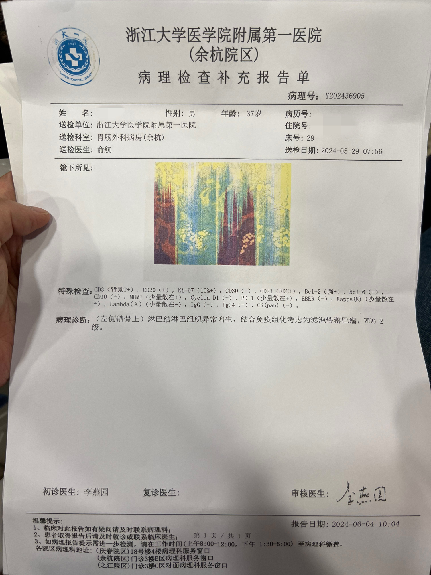 除了全身淋巴结肿大,易体乏,所有血的指标都正常。病理免疫组化报告显示考虑滤泡性淋巴瘤,为啥显示考虑2字,是不确定吗?医生建议做PET- CT和骨穿。