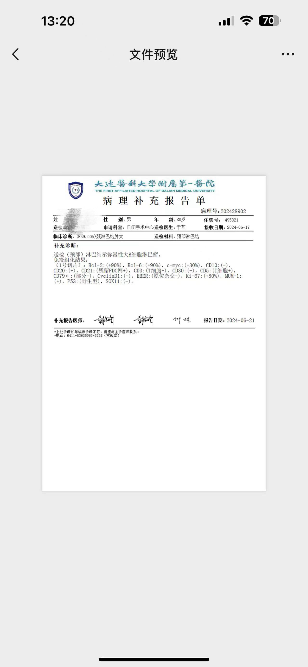 病理报告滤泡性淋巴瘤1-2级