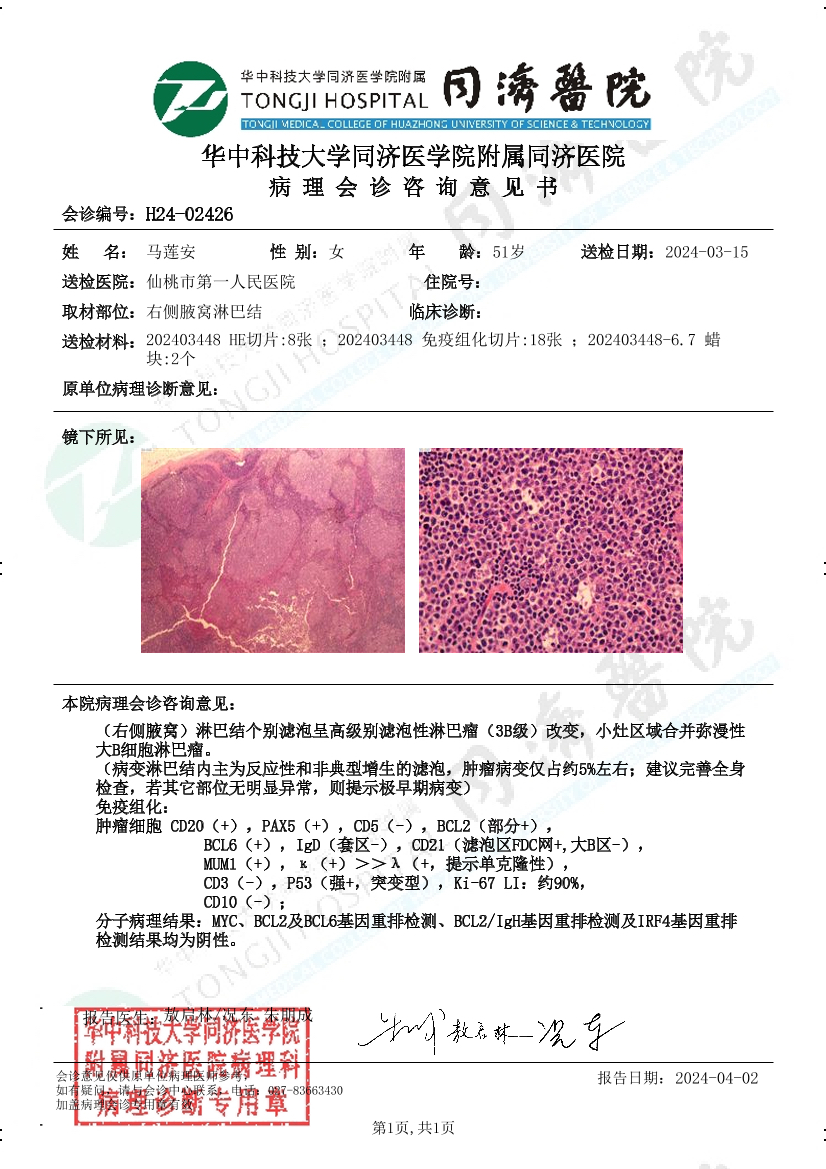 hope0401 发表于 2024-07-15 21:15 FISH排除双打击,看免疫组化你母亲应该属于非生发中心型,但是否双表达无法判断,P53确实呈突变型强表达,这点算一个危险因素,但和TP53基因突变是两码事,只有二代基因检测才能确认是否存在TP53突变。