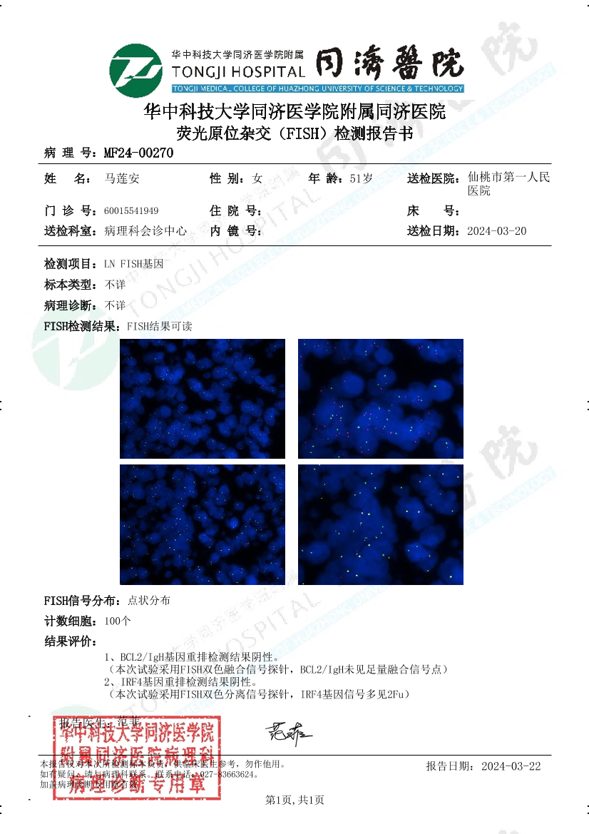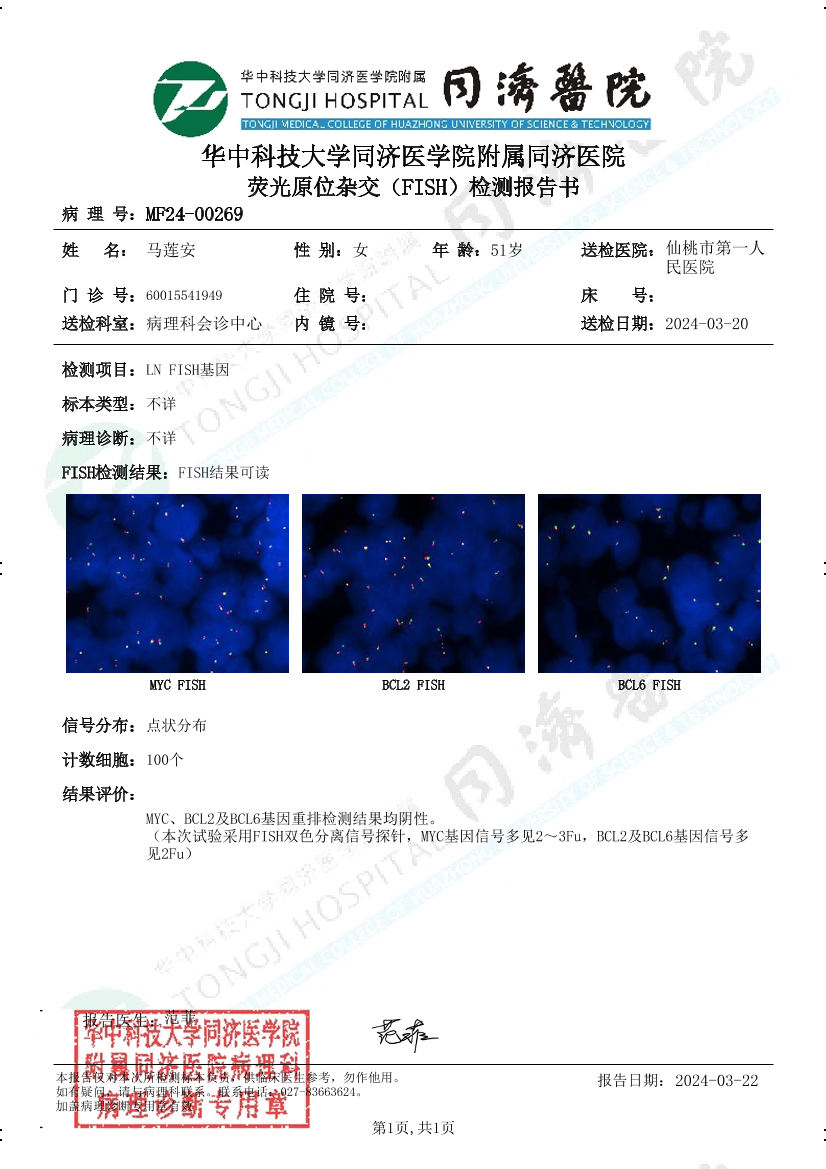 hope0401 发表于 2024-07-15 20:58 这个免疫组化里没有C-MYC这一项,BCL2和BCL6也没有标注阳性率。FISH里排除了双打击,但免疫组化无法判断是否双表达。