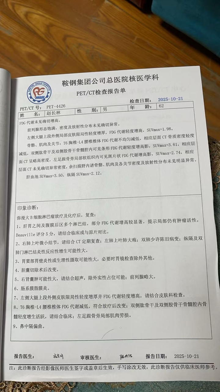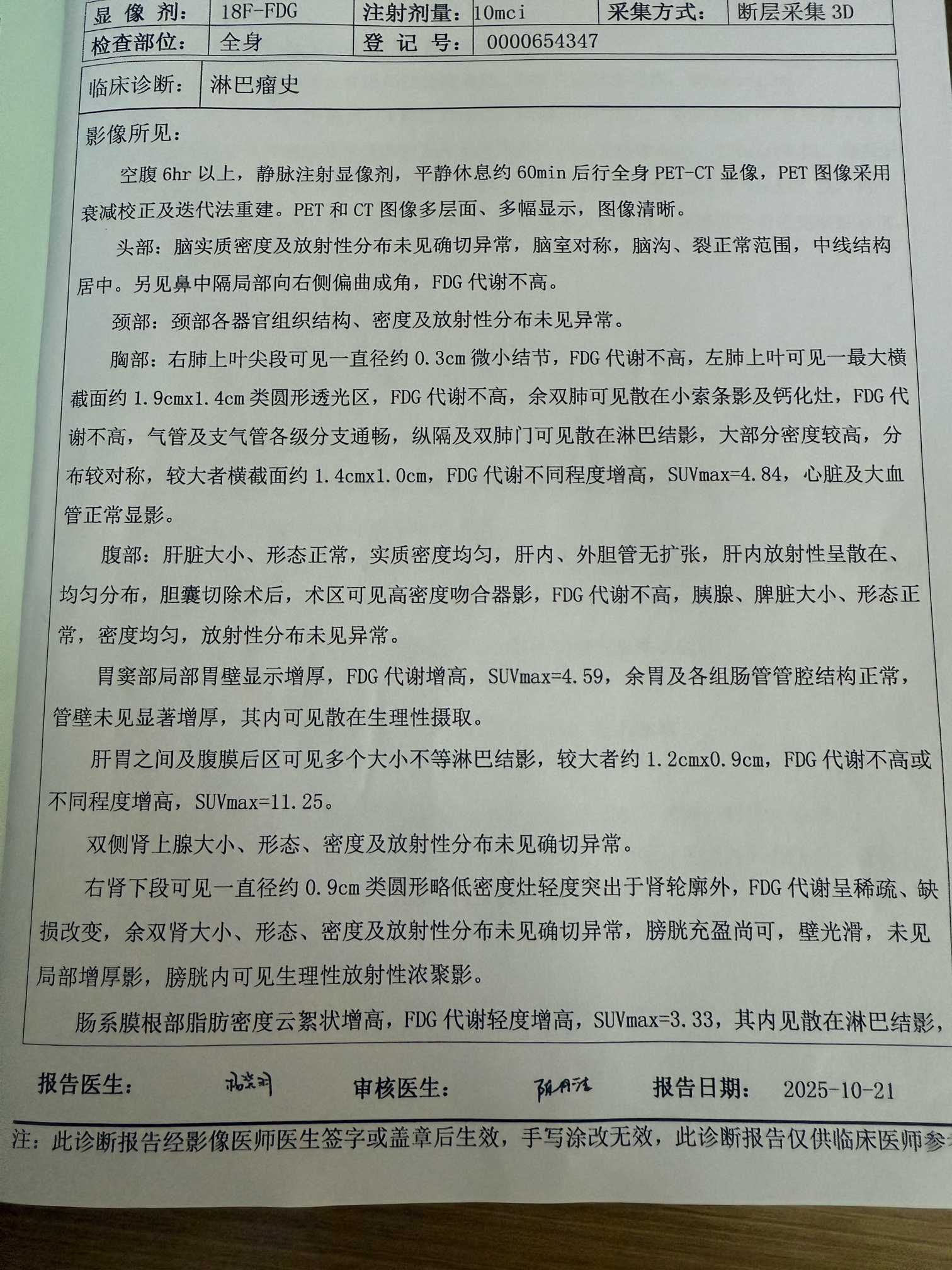 godfamily 发表于 2025-10-23 16:47 大神,在问您后我爸爸又做了两个化疗,主治医师认为未必是复发。然后24年11月显示完全缓解,25年3月也做了一次显示完全缓解,今年10月老家刚复查还是腹膜区域又一次提示,大小和去年9月差不多,但是SUV比去年高,达到11了。评分还是5分,能麻烦您帮忙看看这个是否大概率复发了?