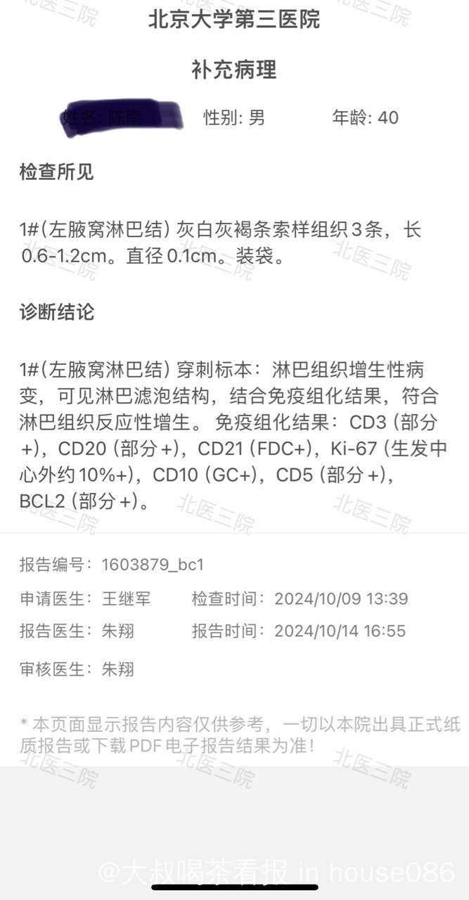 报告良性,然后我打电话去北三病理科咨询,对方告知这个病理结果是很确定的,虽然粗针穿刺不如活检,但是由于其他检查和临床症状也不支持淋巴瘤,所以我暂时先放心了,后面继续每三个月复查比超观察。由于我之前比较焦虑,感谢回复我帖子的人,谢谢。