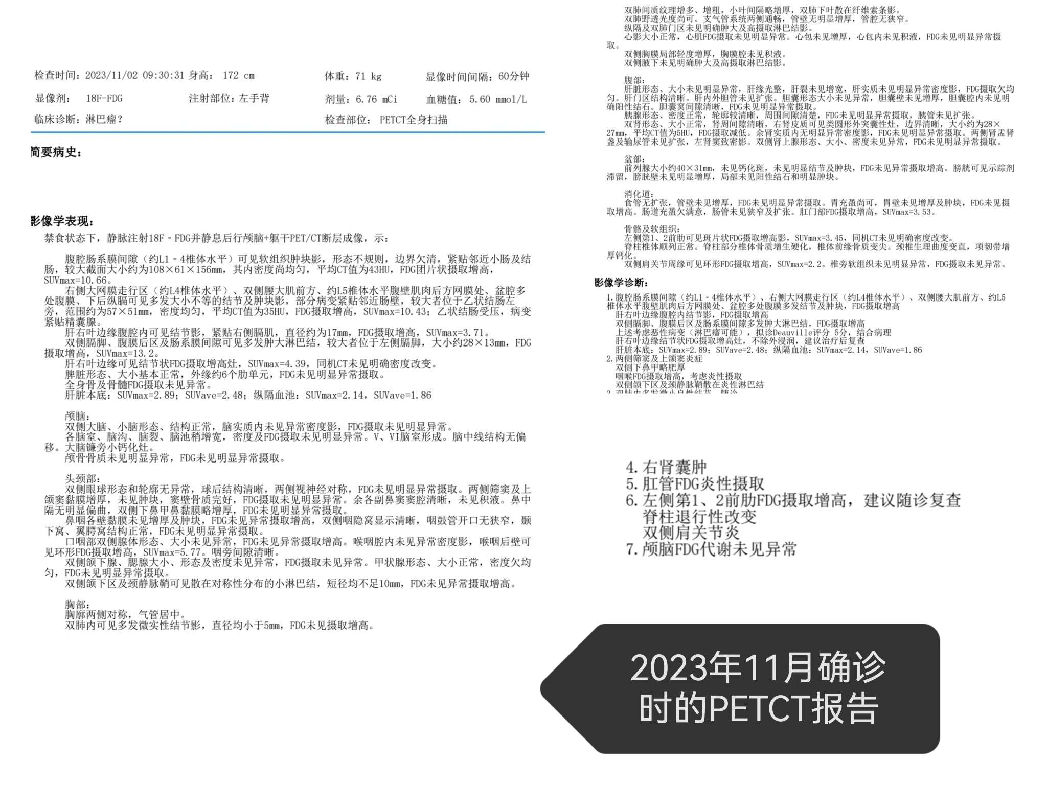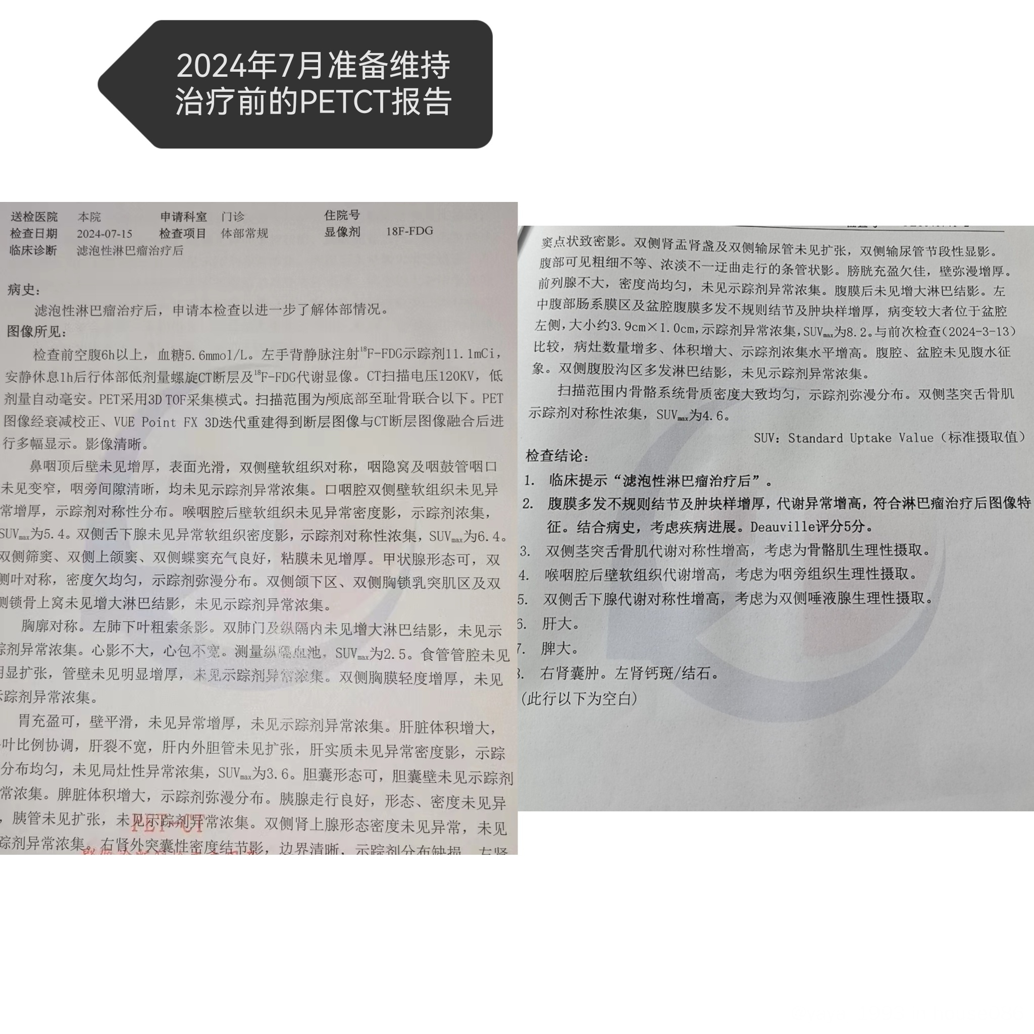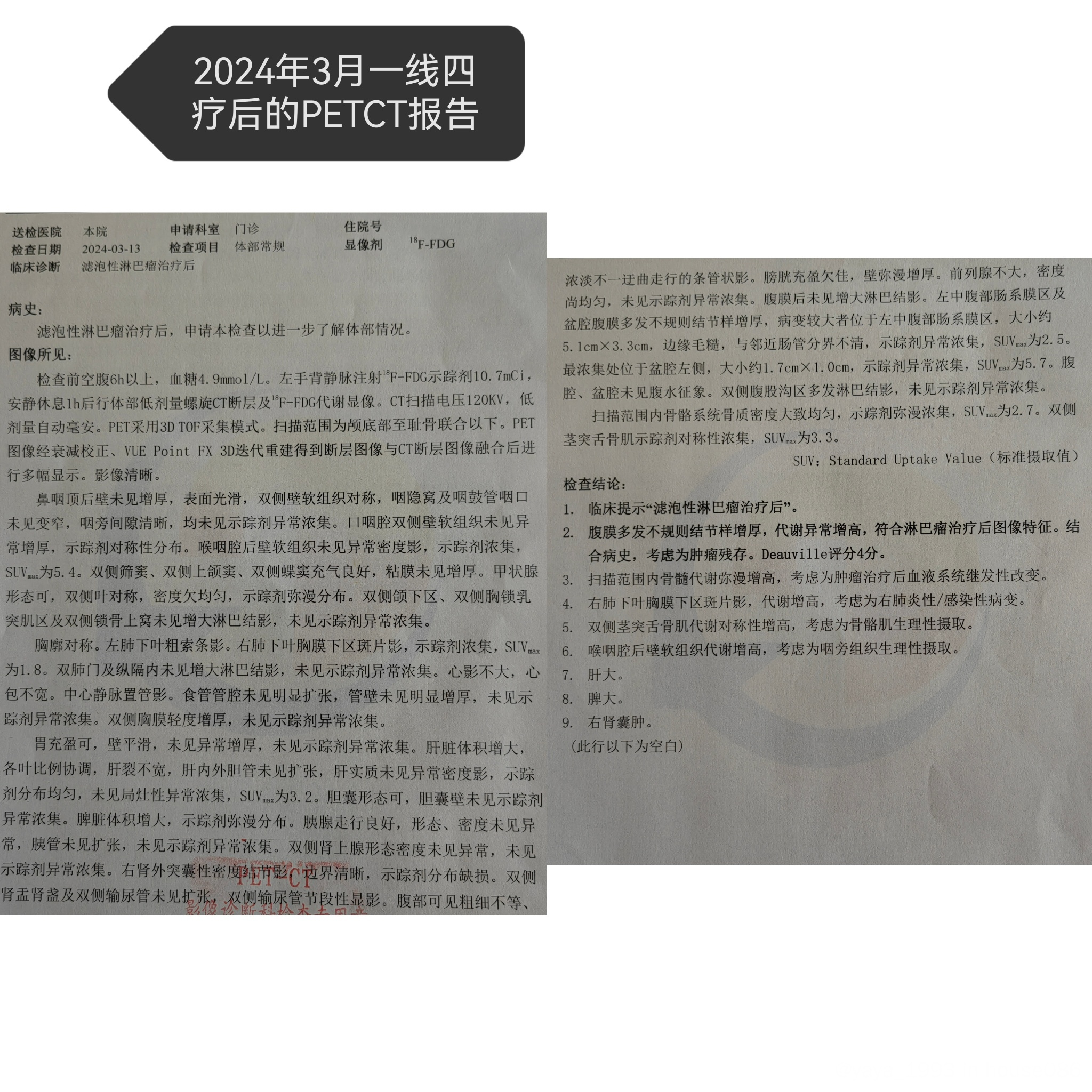 苯达方案后短期内复发,这种情况下高达70%的患者存在大B的转化,原则上说,应该通过穿刺活检排除转化。目前采用了PI3K抑制剂治疗,后期怎么做,主要取决于治疗的效果,从规范治疗的角度说,如果没有发生转化,并且PI3K抑制剂治疗效果理想,那就继续治疗下去,直到再次出现疾病进展,在此之前不需要考虑移植或者CAR-T,如果治疗效果不好,优先选择CAR-T,因为不知道是否对化疗敏感,通常从移植中获益的只有化疗敏感的患者。