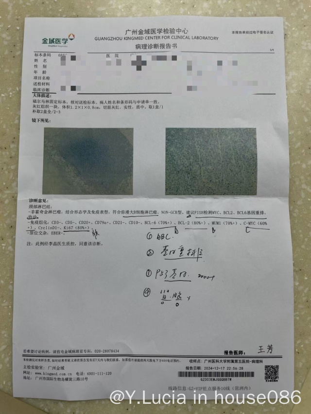 最初12.10号血小板低,发烧,全身乏力疼痛住院,然后进行骨穿 活检确诊弥漫大B细胞淋巴瘤 NON-GCB型。所有报告如下