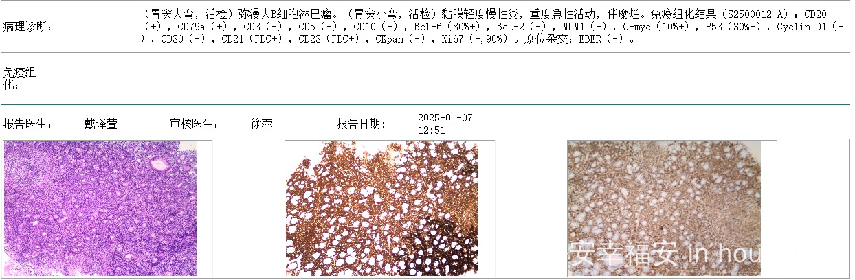 觉得胃胀,去做无痛胃镜查出来的。无发烧,无消瘦。做胃镜检查出来的,免疫组化结果确诊弥漫大B细胞淋巴瘤。