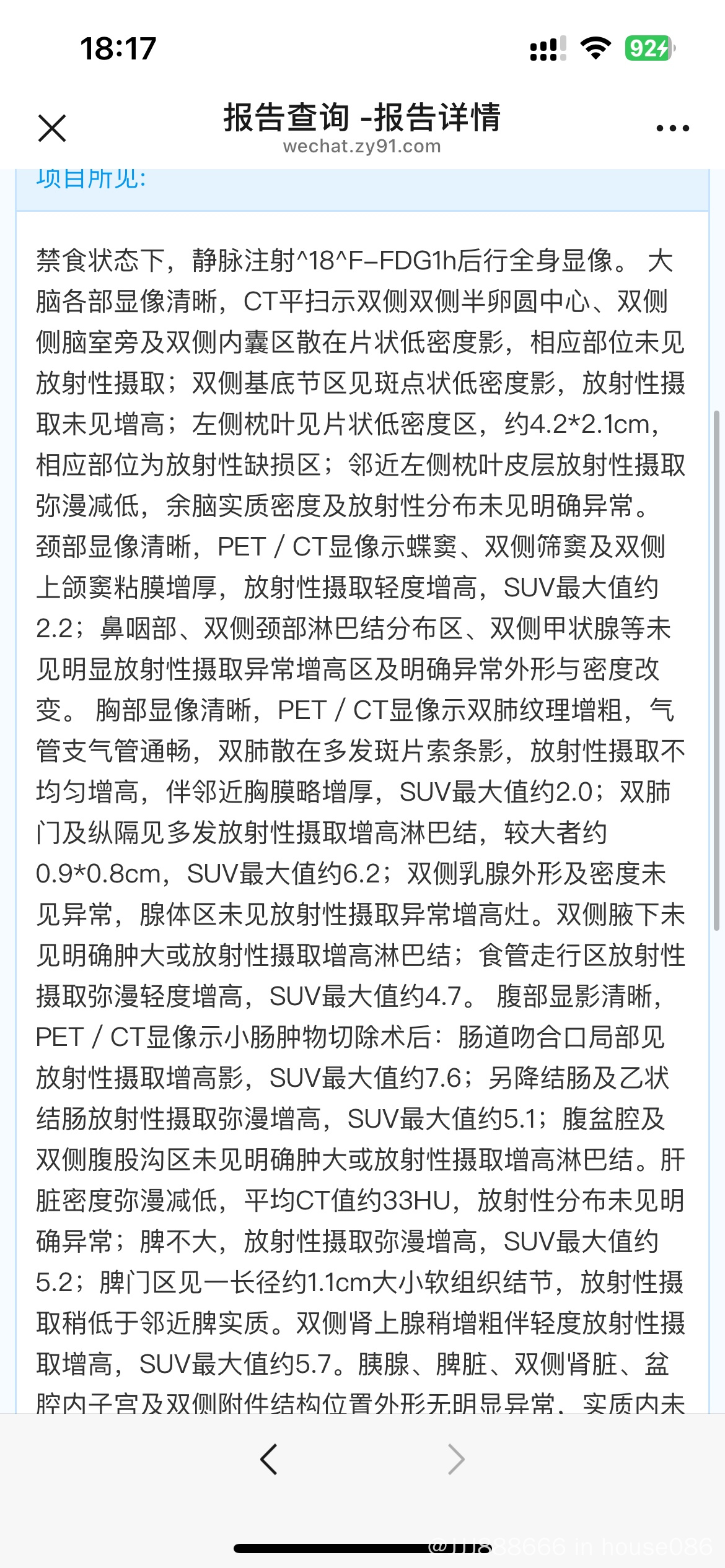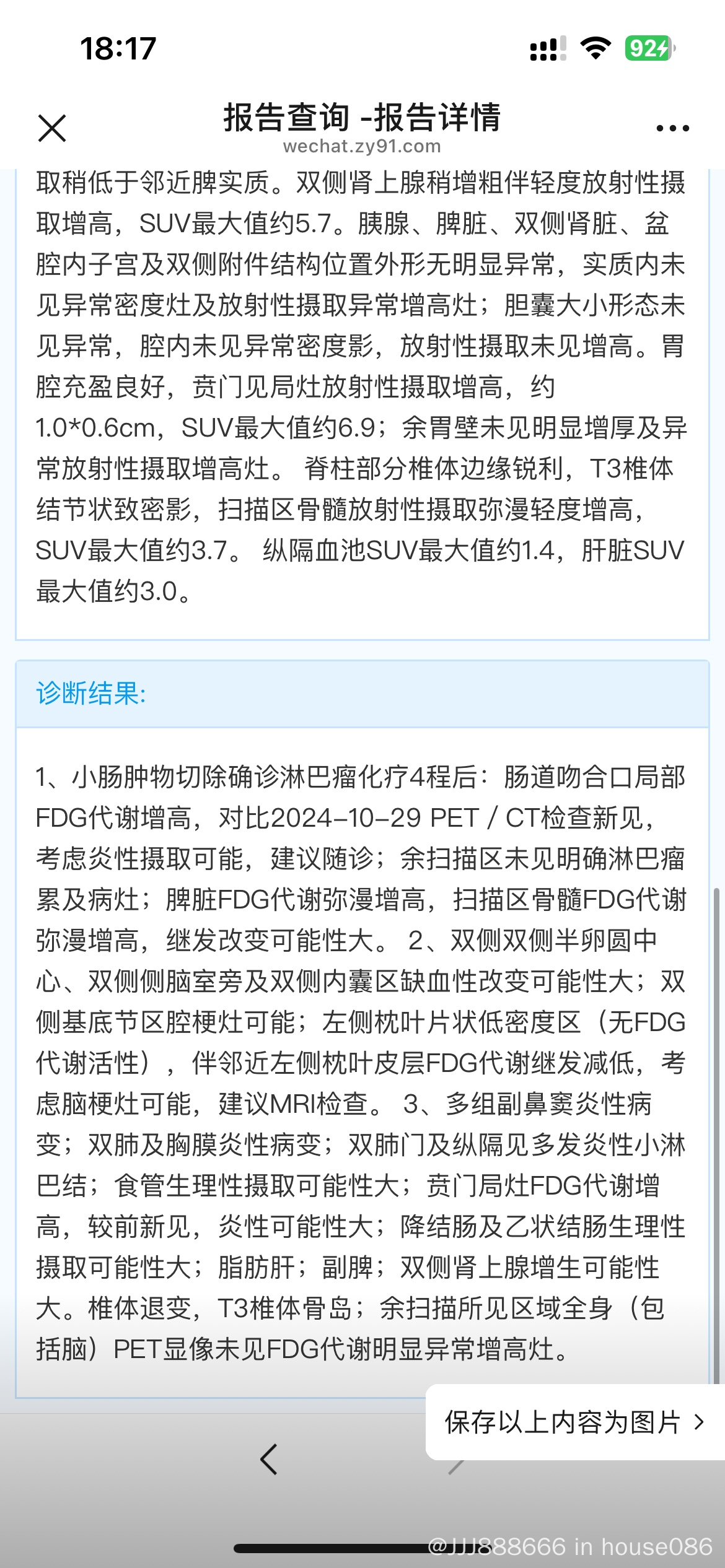 求各位老师帮忙看一下,我妈妈70岁,四疗结束以后做的PETCT,原来的病灶在小肠,在做别的小肠手术的时候一起切除了,这次PETCT显示看见“脾脏FDG代谢弥漫增高,扫描区骨髓FDG代谢弥漫增高,继发改变可能性大”,想了解一下这段话意味着是有可能在脾脏和骨髓发生侵袭感染吗?