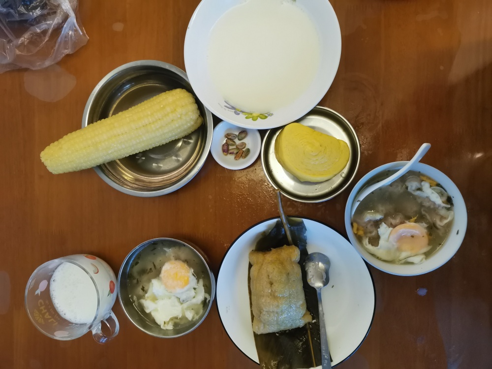 女儿快要中考了,生病以来,只要我在家里住,我基本上都是六点半起来给她准备营养早餐,今天的早餐有馄饨、荷包蛋、粽子、玉米、豆浆、开心果,玉米馒头是我的。