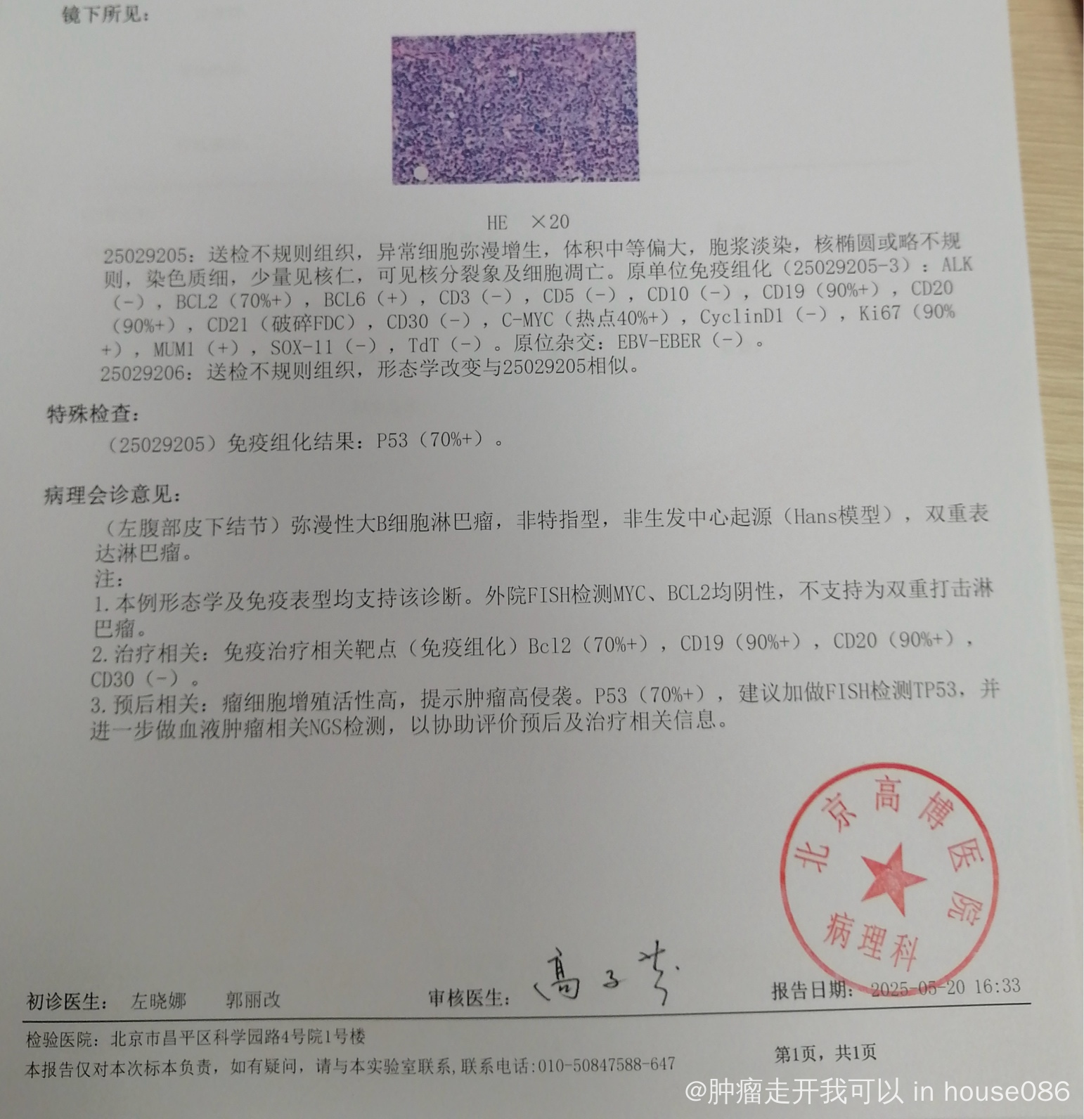 4月30日,我们在本地医院确诊弥漫大B双表达。后续了解到淋巴瘤请专家病理会诊确认会更保险,在之家app里发现可以申请病理会诊,便联系了之家帮忙申请高子芬教授的病理会诊。特别感谢之家工作人员团团和静静,一直耐心解答我的疑问,帮忙提供一些医院需要的材料。当天收到染色片就给到了医院,3天左右就出了结果,非常迅速。病理结果与之前一致,放心了不少,安心治疗。再次感谢之家工作人员们热情又周到的服务!