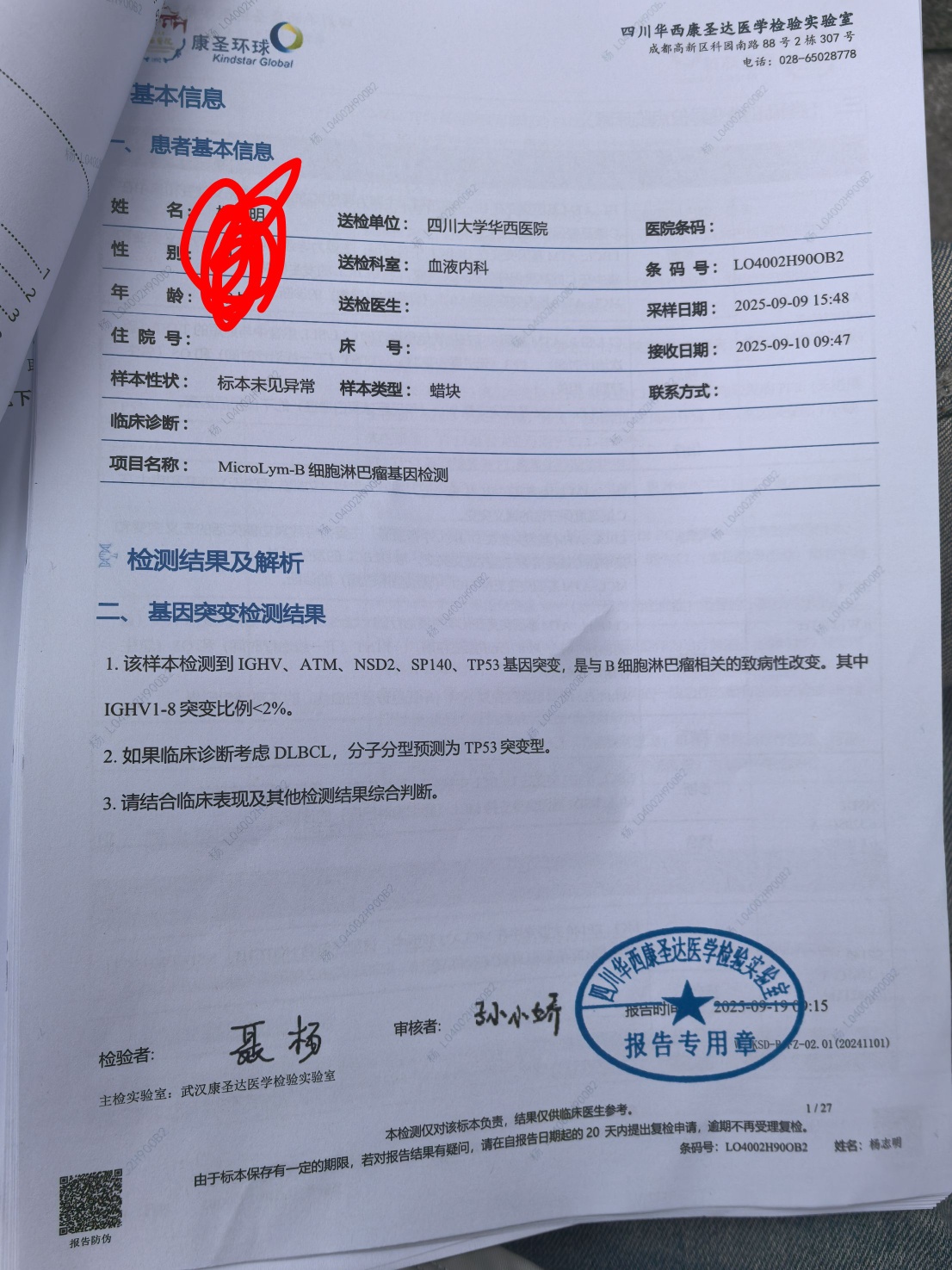 假定病理是弥漫大B,那么目前已知大B的基因突变有几百个,平均每个人差不多有二三十个驱动性的基因突变,谁的大B细胞淋巴瘤都不可能只有DTX1这么一个突变,而IGHV突变检查只适用于慢淋,对大B来说没有意义,所以我说这个二代测序没有价值。