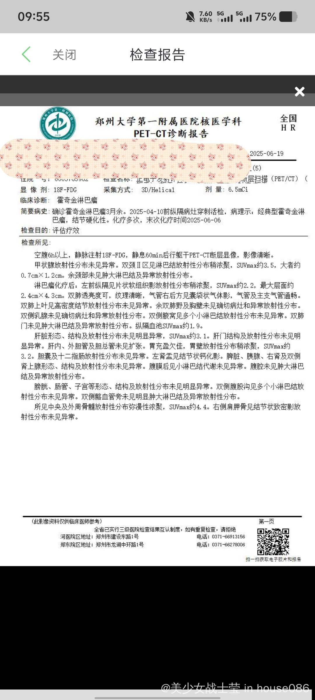 平静以后,经过上海专家讲解以及同学朋友及郑州专家咨询过后,我了解到得霍奇金淋巴瘤是不幸中的万幸,治愈率竟高达90%,这个分型也是淋巴瘤中占比比较低的,大概10%,预后比较好,只需经过化疗+放疗就能轻松拿下它,这比刚开始误诊我是胸腺瘤,生命所剩不多,需要开胸手术可强太多了。经多方咨询,这个病初治方案国际标准方案abvd或bv-avd,考虑到化疗战线长,期间养大于治,需要格外注意回家后饮食,环境以及骨髓抑制的处理,我和老公决定回到家乡郑大一附院治疗,也是全省淋巴瘤治疗研究中心,大主任张明智csco指南编委成员,经验丰富,当然离家近,化疗后居家疗养更方便。