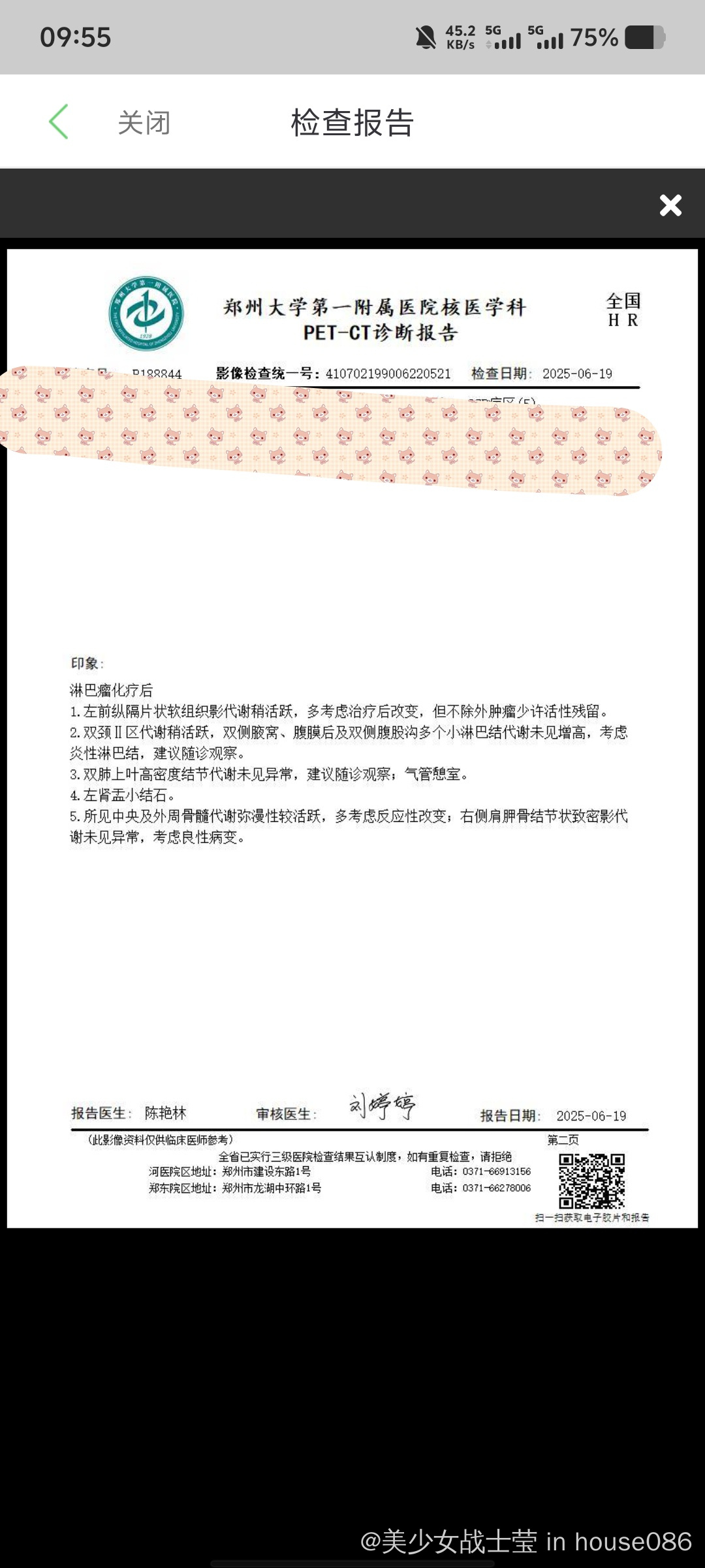也许一切都是命运的安排,一切都是冥冥之中自有定数,一向身体康健,孕检产后体检一路绿灯的我竟然在产后1年意外发现了纵隔巨大占位,也许老天爷及时点醒了我,让我放下繁忙的工作,孩子,家务全身心投入到身体康复方面。4月上半个月我和老公辗转郑州,上海最终确定病情-霍奇金淋巴瘤。