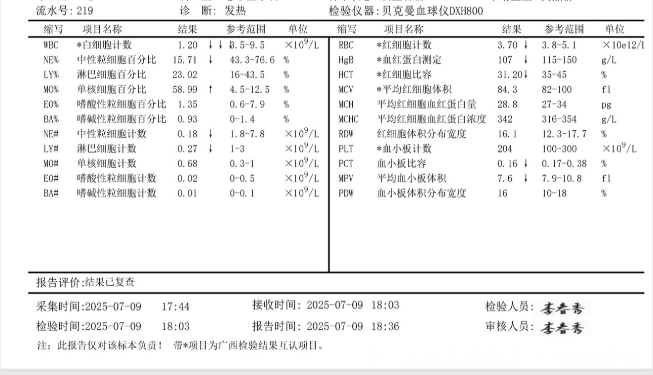 妈妈六疗结束,六疗后第二第三天带她打了升白针,后来没去验血,因为前五次只要提前预防白细胞、粒细胞都会维持在正常水平。本着习惯性判断,周一来维护PICC时虽然有点纠结但还是没去验血,结果第二天妈妈就发烧了,以为是普通发烧,吃了一粒退烧药好了也没来,第三天又烧,感到不对劲了,直接来医院,血常规一看白细胞掉到了1.3,粒细胞0.18了……昨晚紧急办了住院打了300微克升白针,今天还烧到40度,继续上抗生素,今天又打了600微克升白针。现在还有点烧,38.5度……太难了了,希望升白针赶紧起效!也提醒大家化疗期间真的半点都松懈不得!