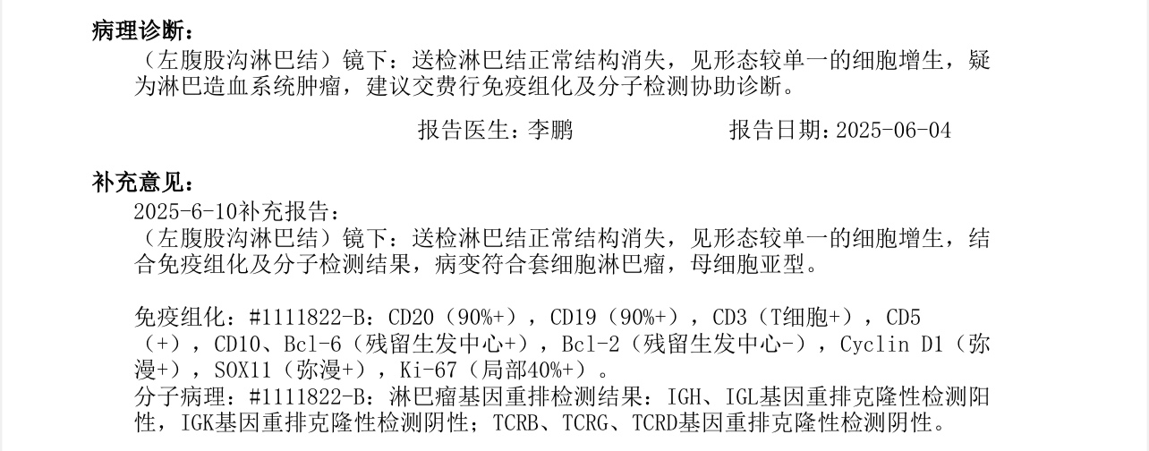Ki67只是局部40%,与典型的母细胞型套细胞淋巴瘤不太符合,应该是根据细胞形态做出的判断,但是形态学很多时候是见仁见智的,应该是由临床医生结合多个因素做出最终的判断,或者找权威病理专家做会诊。 |