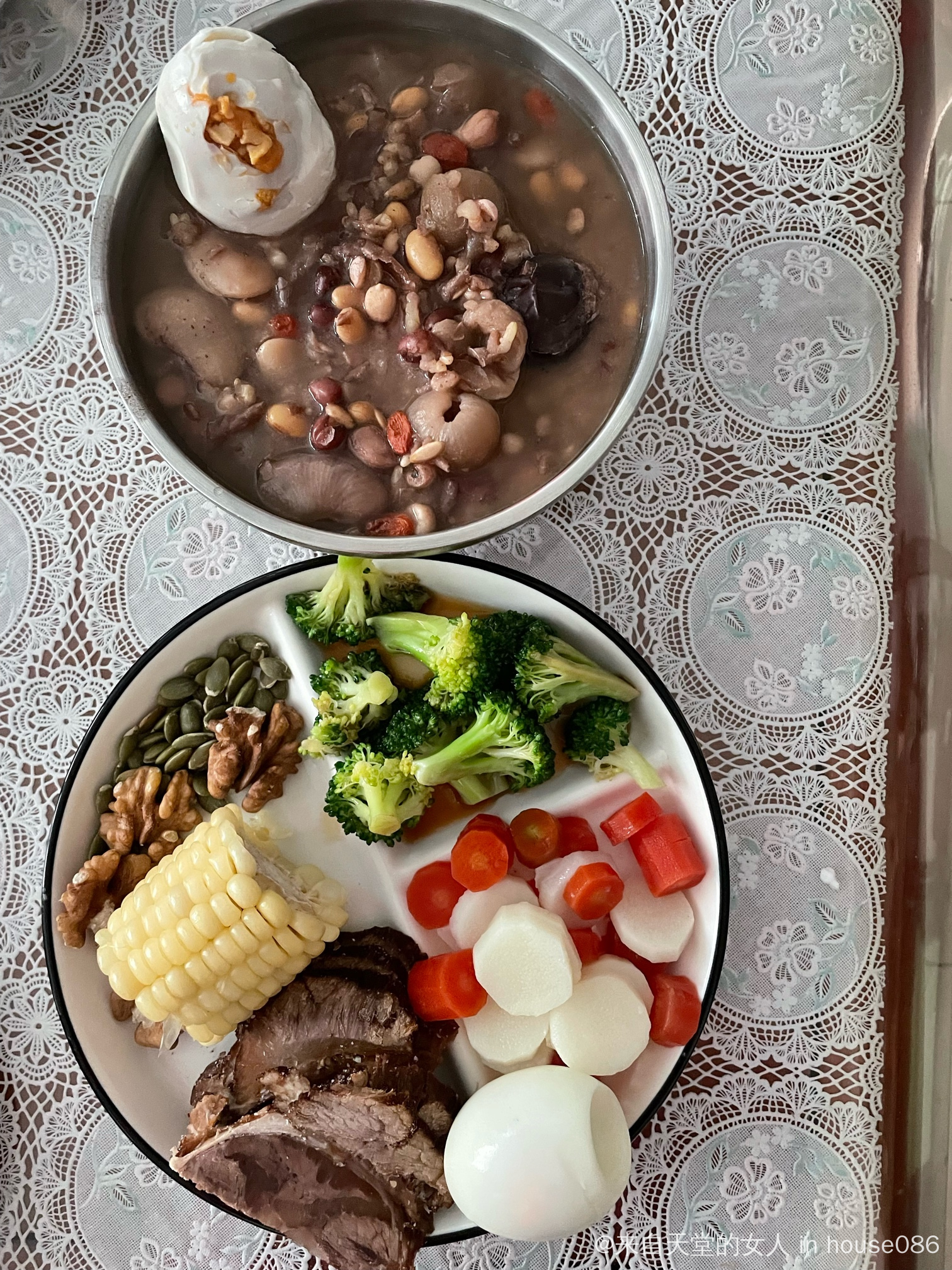 粥:红皮花生米、花生衣、红豆、糙米、炒薏米、黄豆、西洋参、桂圆、红枣、枸杞、白芸豆(粥中加黃瓜籽粉、亚麻籽粉、蛋白粉、咸鸭蛋)