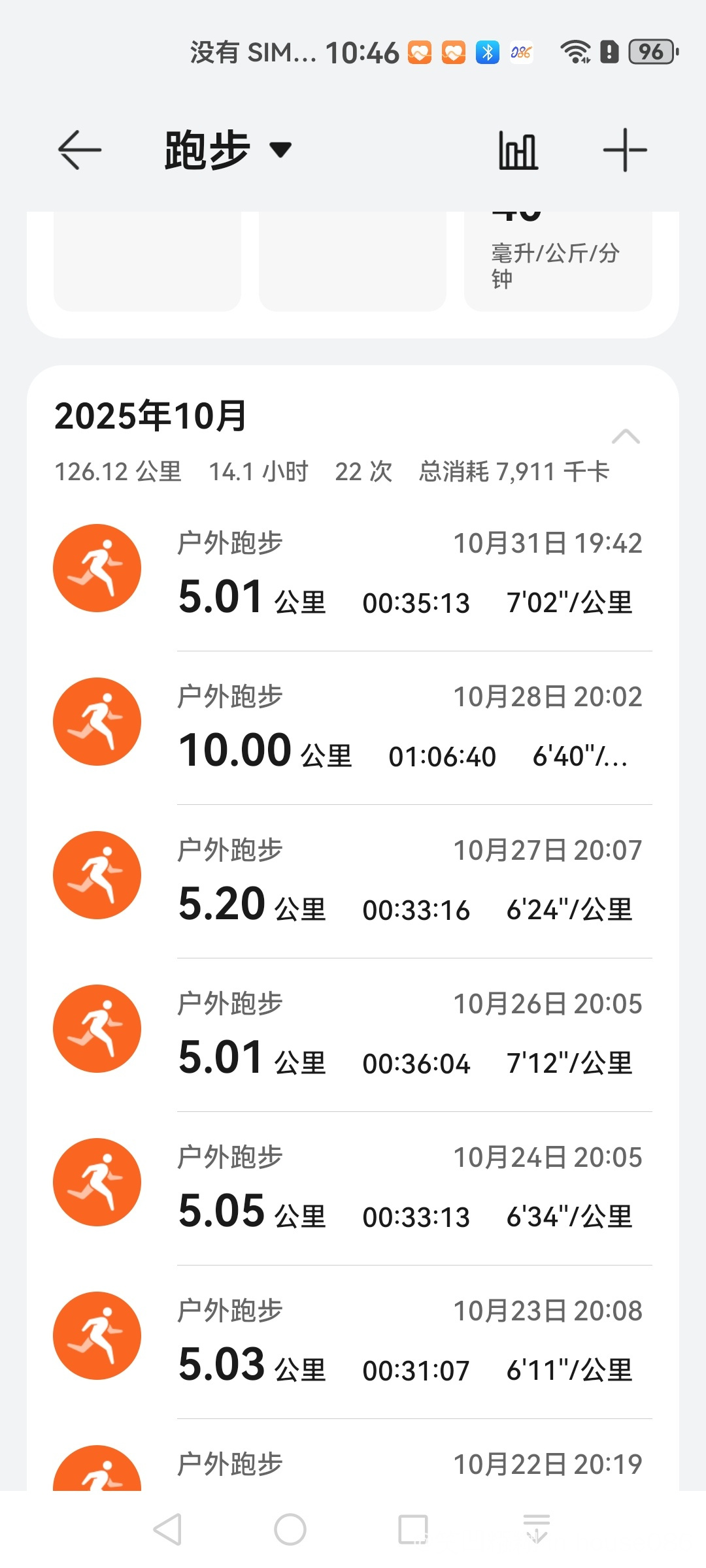 10月份月跑量累计:126.19公里,用时14.1小时,出勤22天,总消耗7.911千卡。10公里长距离4次其余都是5公里。10月再见11月继续加油!