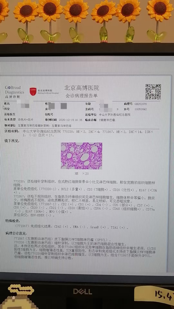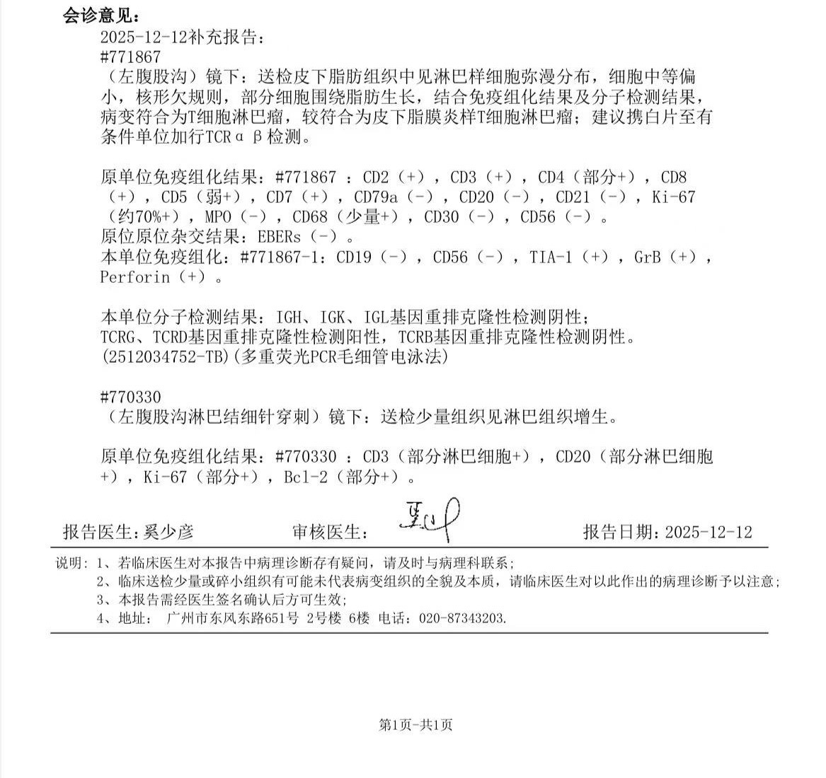 雨丝大神求助,因为家里人一开始一直发烧,后面去中大二院发热查因,开始低烧后面高烧,淋巴结穿刺后腹股沟就硬了起来一块,硬了一个月,现在慢慢消了,但是还有鹌鹑蛋大小一个包,开始皮肤紫红色,现在慢慢红色,淋巴结穿刺反应性增生,后面在二院做了活检,取到了脂肪组织,怀疑炎症或脂膜炎样t细胞淋巴瘤,后面去中肿重新做了病理,觉得是脂膜炎样t细胞淋巴瘤,后面问了中肿的教授建议化疗,也去了北肿建议先吃沙利度胺,后面在考虑化疗干细胞移植,协和的建议是长期吃环孢素,之前是做了病检之后上的5mg地塞米松,立马就不发烧了,后面也是口服8片泼尼松,血象,肝功,炎症指标都正常了,希望老师帮忙给点建议,我们现在应该怎么办,本人也是广东别的科室医生,科室不同,确实都不懂。@橙色雨丝 @橙色雨丝