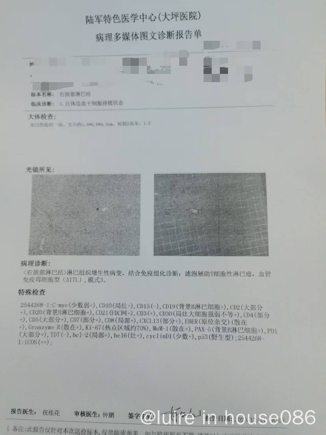 昨晚病理结果还未出来,和主治医生讨论,说大概率为弥漫大B,商量了几种方案,今早刚给医生答复说想按cart的方案去治疗。结果计划赶不上变化,病理结果再次让我们措手不及。
