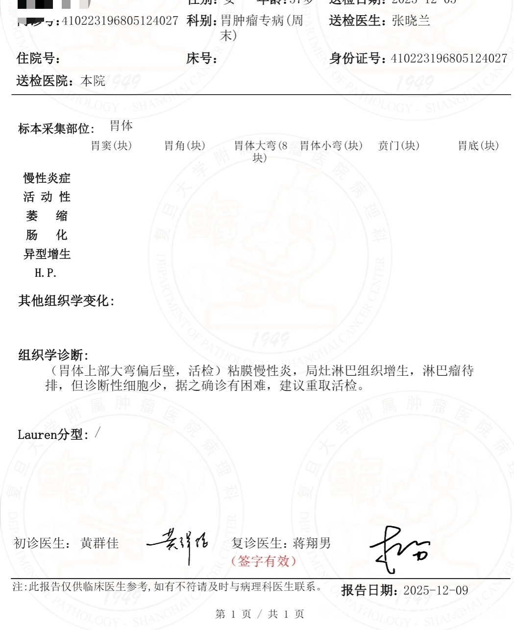 5月,8月,12月在复肿做的胃镜+超声胃镜,都没有充足证据确诊