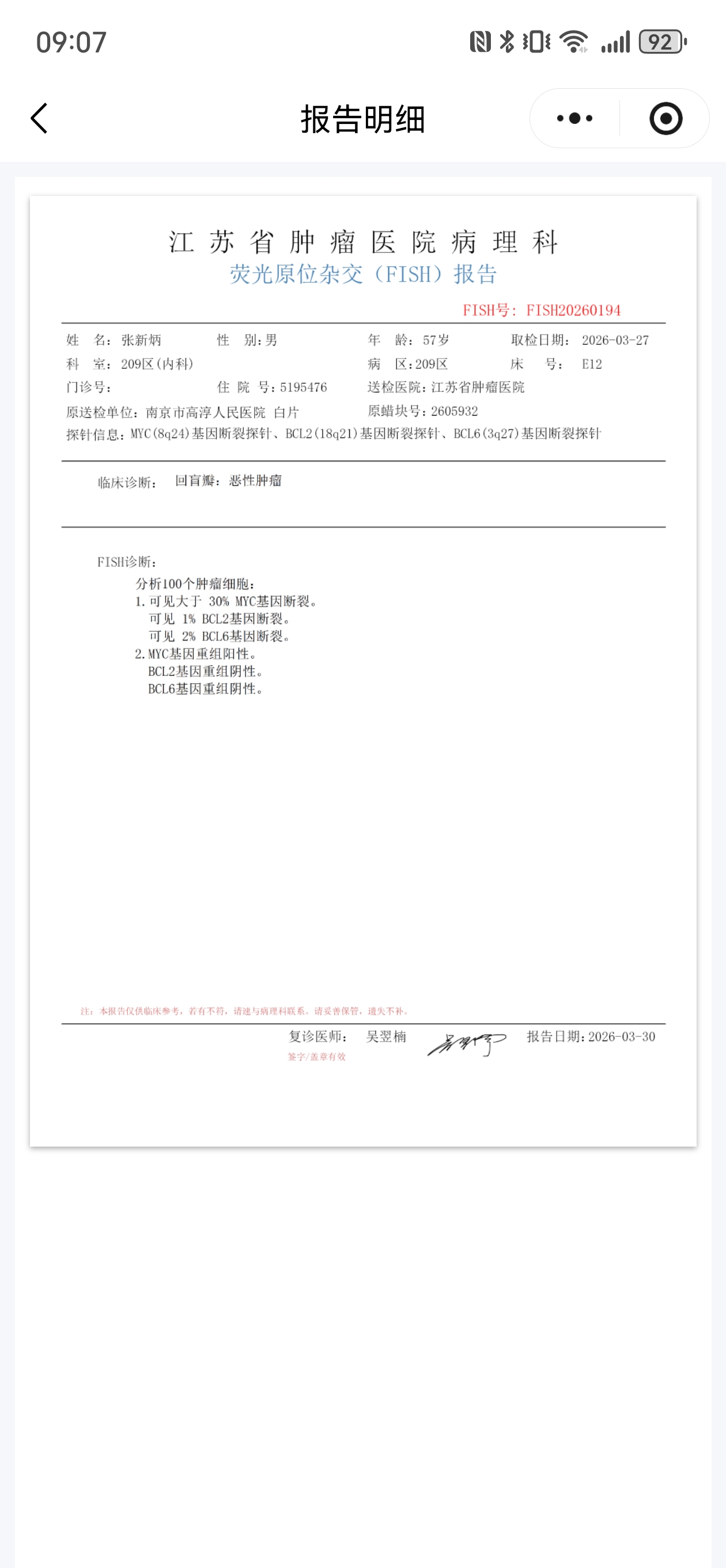 晴天-淋巴瘤之家 发表于 2026-03-31 09:53 不是双打击确实是个好消息,不过单MYC重排,结合之前的免疫组化与petct腹膜后少大包块的情况,有点伯基特的倾向,建议重新找权威的病理专家会诊一下