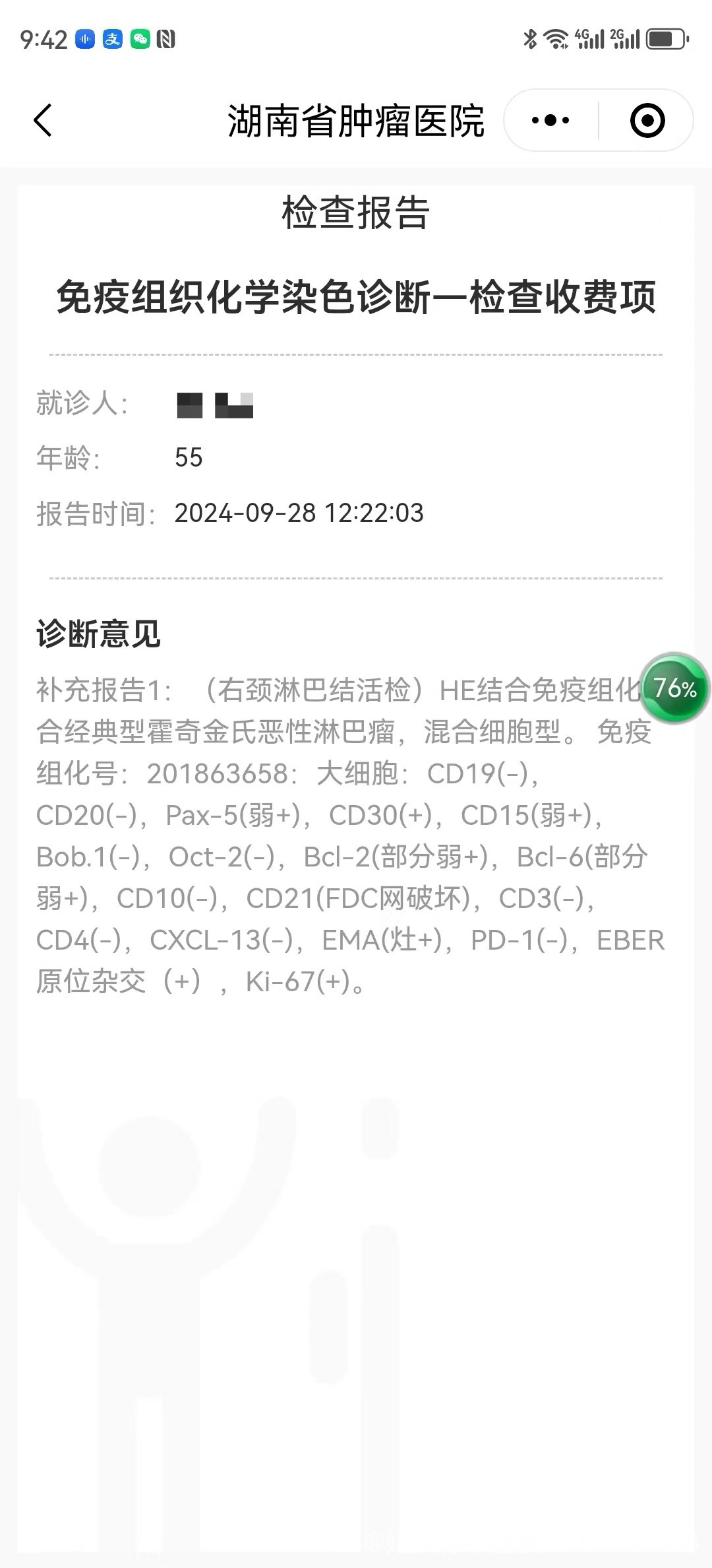 2024年10月11日中午,得知爸爸确诊经典型霍奇金氏恶性淋巴瘤(混合细胞型),一个从未听说过的医学名词。在慌乱的用手机一通搜索之后,悬着的心稍微好一点,很多病友分享说这种肿瘤治愈率高达80%-90%,传言上海瑞金医院可以有近100%的治愈率因此都不能进大病医保。而且有成熟的治疗方案,预后也很好。有病友分享她六个月的结疗经验给了我很大的信心。仓促之中还下载了“淋巴瘤之家”App,创始人洪飞告诉我“好好配合治疗,在湖南肿瘤医院治疗就可以了”,给了我很大的信心。但是家里的亲友仍然在为是否在湖南治疗还是在北京上海治疗争论不休。我理解他们的好意,他们害怕我爸在长沙接受治疗得不到好的效果,后续又要转到上海,这样的话不如直接去北京上海的大医院。