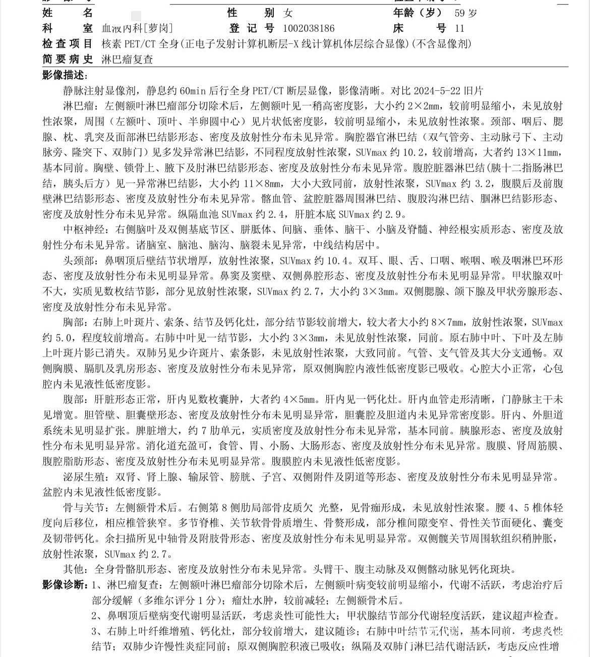 9-12 PET复查 说脑部和肺上的淋巴瘤已经消掉,PET评分1分。