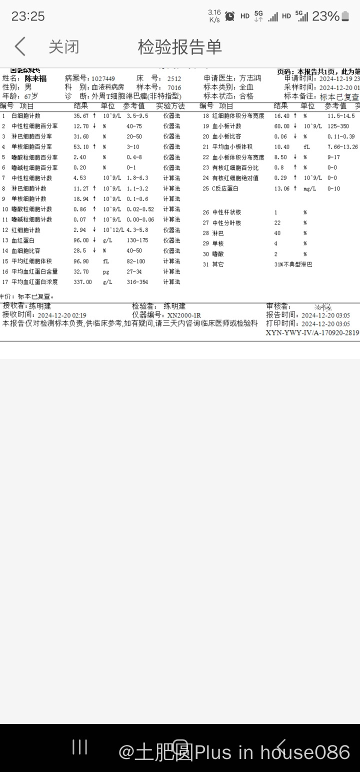 八、2024.12.20复查血常规,白细胞、淋巴细胞、嗜酸粒、等等都升得很高(附图)。在这个期间,我爸也发生了发烧(38度以下),包括极其难受的胃痛胃胀反应,恶心。医生分析,淋巴瘤发生了进展,而且进展得非常快,骨髓里面应该都是坏的细胞,生存期不会很长。医生打算下周用药:脂体质米托蒽醌+戈利昔替尼。
