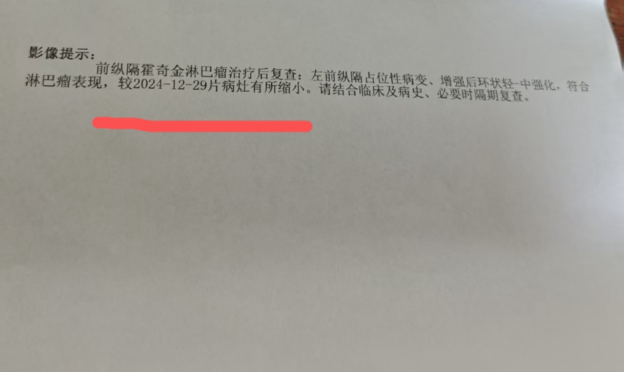 距离离治疗结束已经有4个月了第一次复查的时候拍了个普通CT 肿瘤缩小了了 然后3月底 又复查了做了增强CT 抽血白细胞也恢复正常了是在没有打针和吃药的情况下!然后肿瘤又又缩小了 真的很开心!想把放个好消息传递给病友们!这个病不可怕只要不放弃 好好治疗总会越来越好滴!虽然不知道以后会不会复发什么的但是起码现在是好的!我也不想去想那么多 但是我坚信一定不会复发!