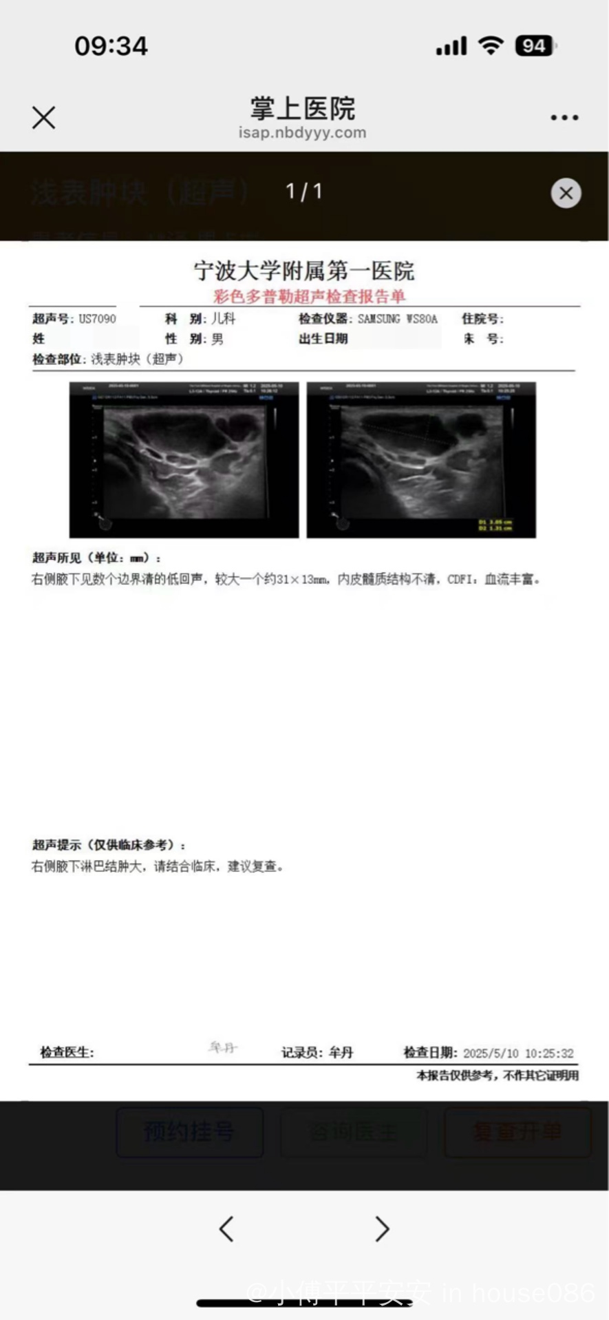 25年4月30日小孩说腋下有点痛,发现有肿块不是很大,5月1号去医院检查B超说是可能发严引起的淋巴结肿大(4月中旬小孩有过低烧,咳嗽),医院配了点头胞。