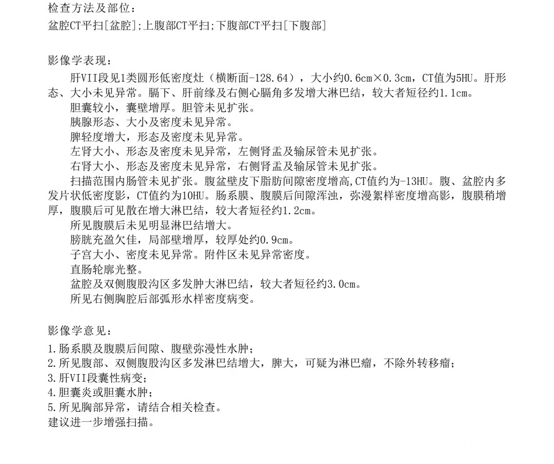 患者年龄68岁,一开始查出血小板低,多处淋巴结肿大,医生按免疫性血小板减少治疗,吃了三个月激素药,期间脖子起红疹,医生说是过敏,脚和腿部有水肿,一直查不出原因耽误了病情,发现已经到了晚期,脖子和手臂上长出来红色肿块。现在不发烧但是夜间盗汗,有腹水,肚胀每天吃不下什么东西。