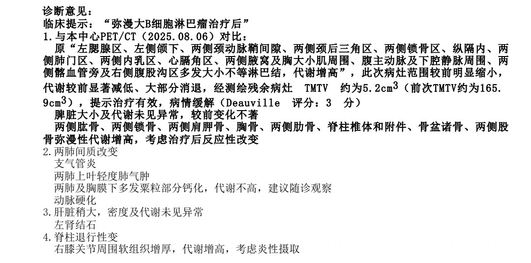 患者是弥漫大b细胞淋巴瘤,生发中心来源,今年八月份确诊的,非双表达非双打击,基因检测分型为BN2亚型,二次pola-r-chp方案治疗后做pet-ct显示大部分病灶已经消失了,还有一点残余,图一是治疗前的pet-ct,图二是二疗后的,治疗前做骨穿显示没有明显的骨髓侵犯,三疗的时候医生说四疗之后再去做一个pet-ct,如果没有病灶了就可以结疗了,因为标准的治疗方案是六个疗程,想问一下大家我们还需要再做两个疗程巩固吗,另外我们这种情况需要做中枢预防吗?