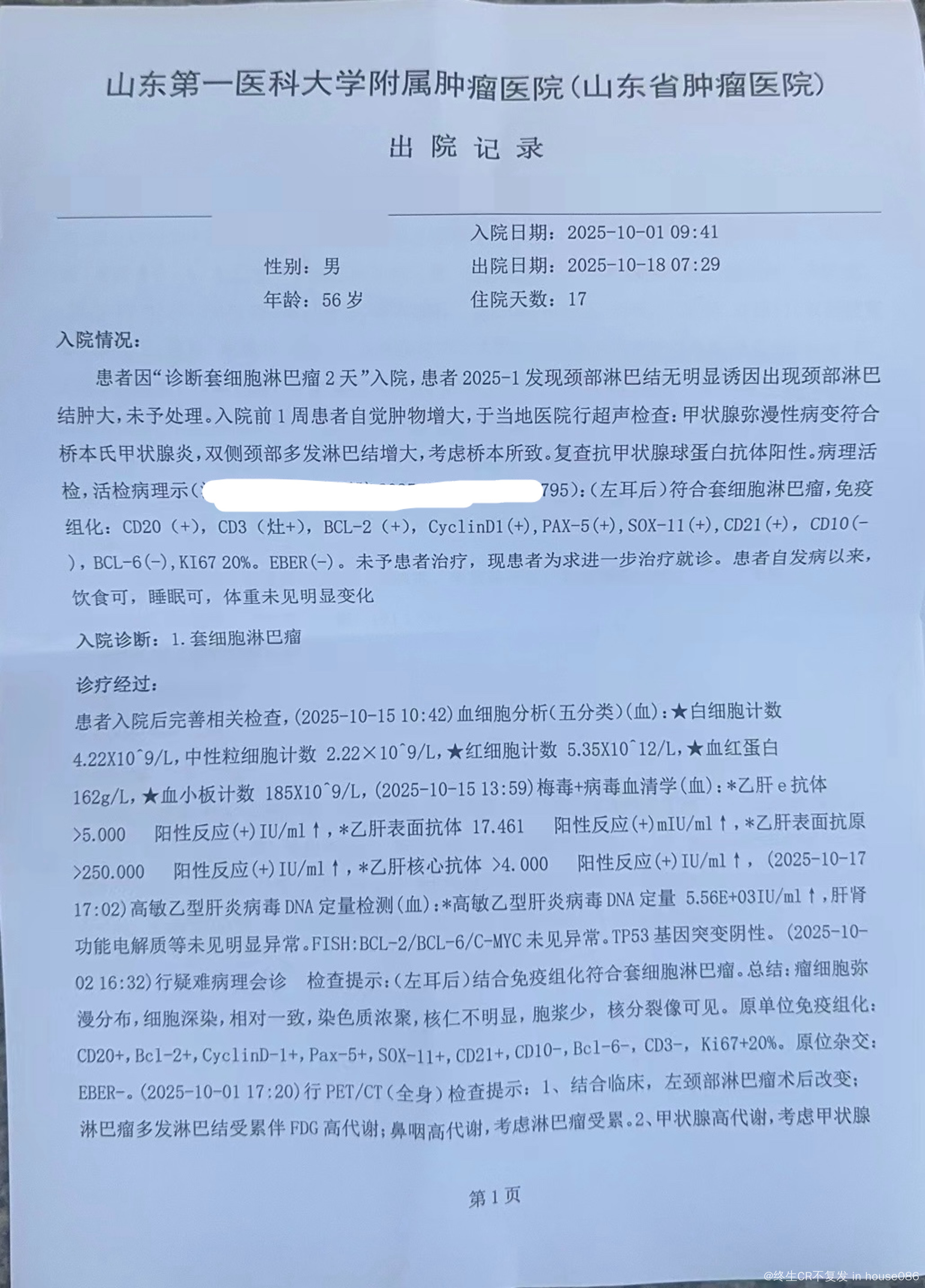 我父亲57岁,身体状态好,今年10月份确诊经典型套细胞淋巴瘤(IV期,IPI 1分):