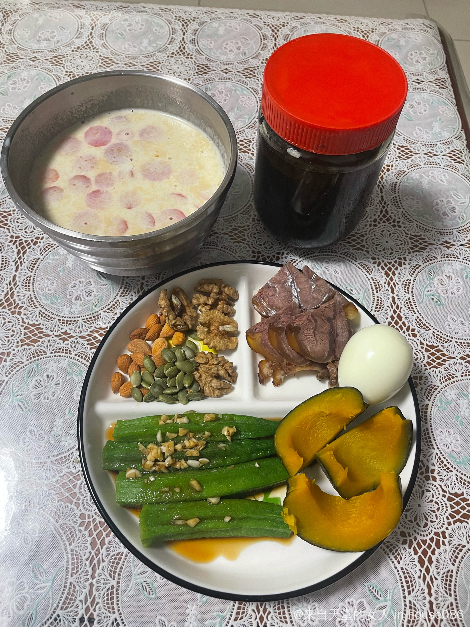 主食+优质蛋白:蒸南瓜(碳水+膳食纤维)+鸡蛋+酱牛肉(动物蛋白),加上那碗“全能糊”:山药片(健脾+碳水)+水果胡萝卜(维C)再混了蛋白粉(优质蛋白),直接把蛋白质和碳水的质量拉满!