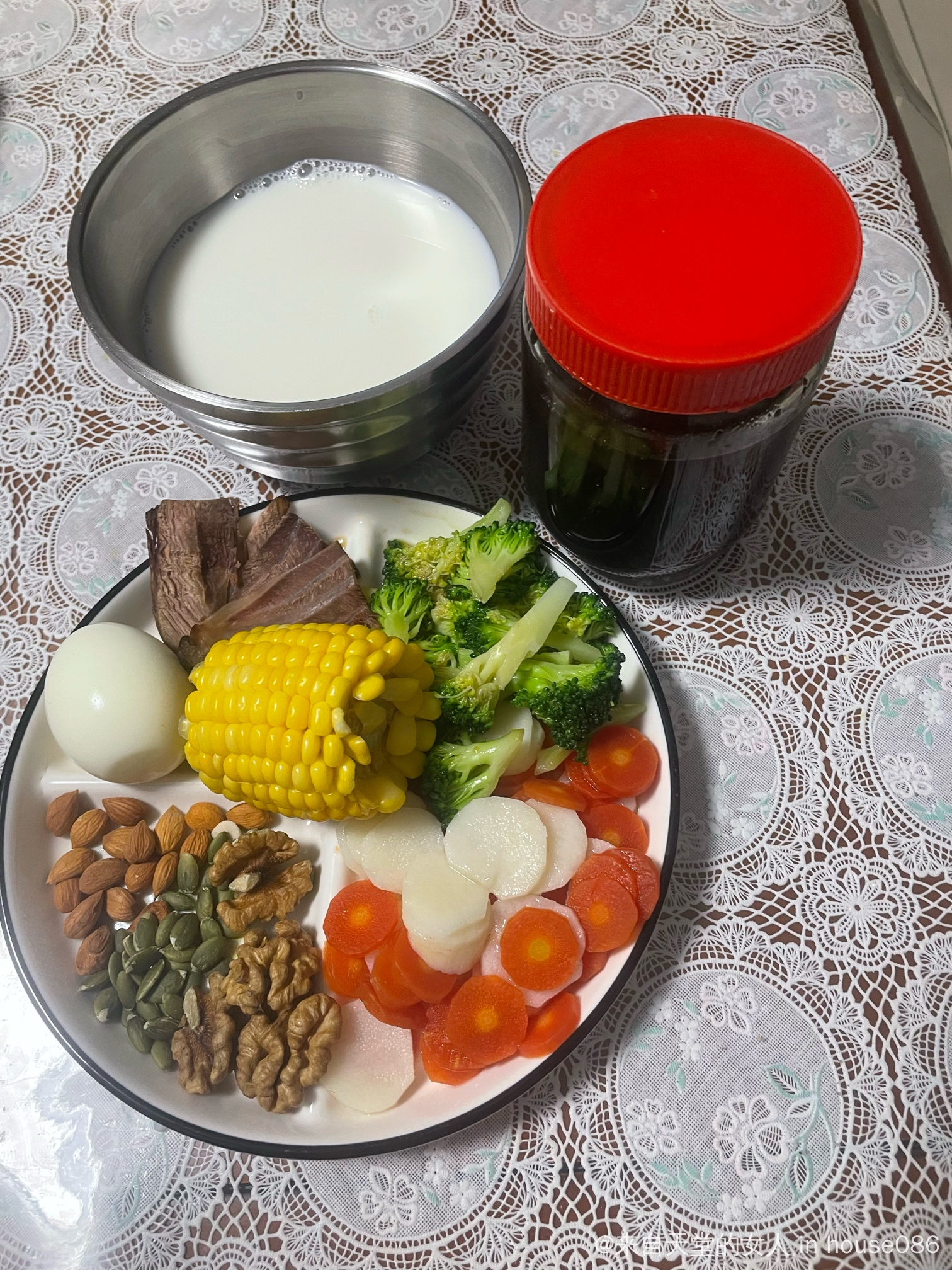 盘里的牛肉是优质蛋白+铁的扛把子,水煮蛋补满优质蛋白,玉米是低GI碳水+膳食纤维,西兰花/胡萝卜/山药补维生素+矿物质,坚果组合(杏仁/核桃/南瓜籽)直接把Omega-3和微量元素拉满~再配上牛奶+蛋白粉补蛋白,黄瓜籽粉(钙)+亚麻籽粉(膳食纤维)的加持,这一顿直接把“全营养”给拿捏了!