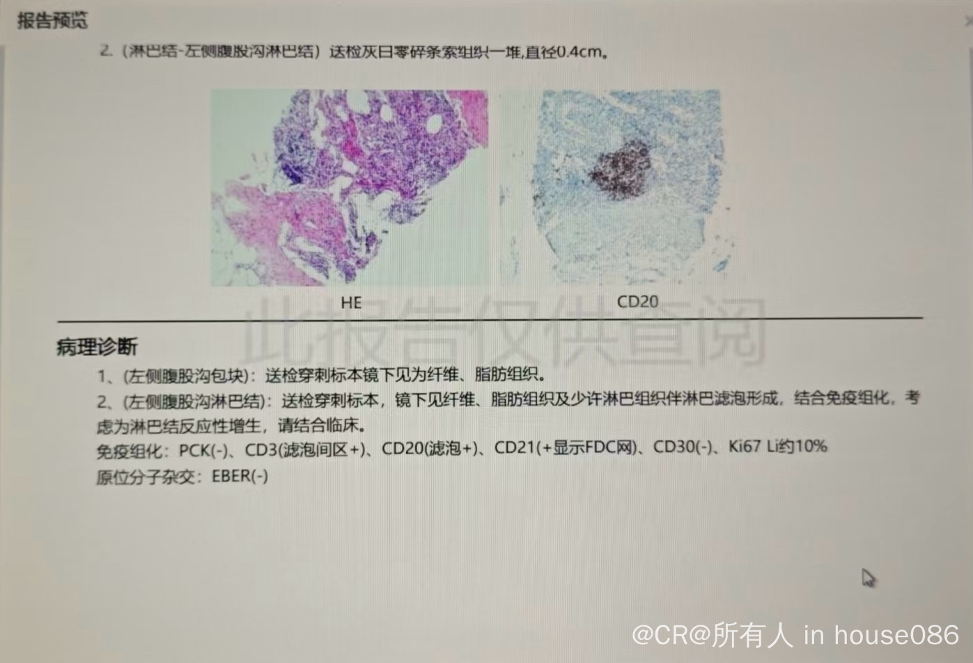 问题:主治医生根据腹股沟部位突然出现的淋巴结,结合LDH和铁蛋白异常增高,判断为治疗过程中进展,并且怀疑穿刺未穿到淋巴瘤组织。请各位家人们帮忙看看这到底是不是进展了?下一步该怎么办?