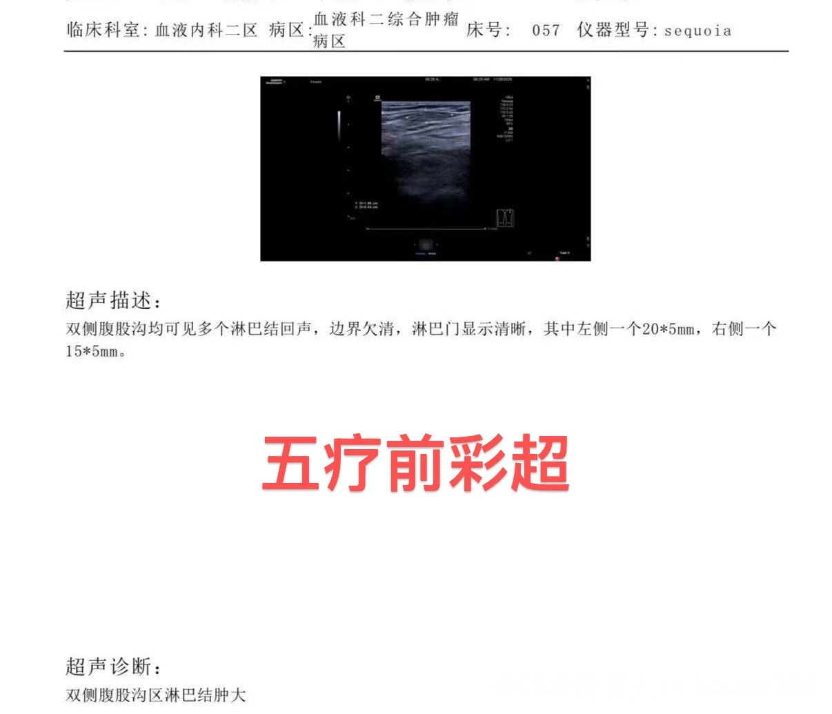 11月26日五疗住院用手摸到腹股沟两侧各新增一个淋巴结,彩超结果左侧20*5mm,右侧15*5mm。(PS:距离中期PETCT评估仅仅21天,期间完成了干细胞采集)
