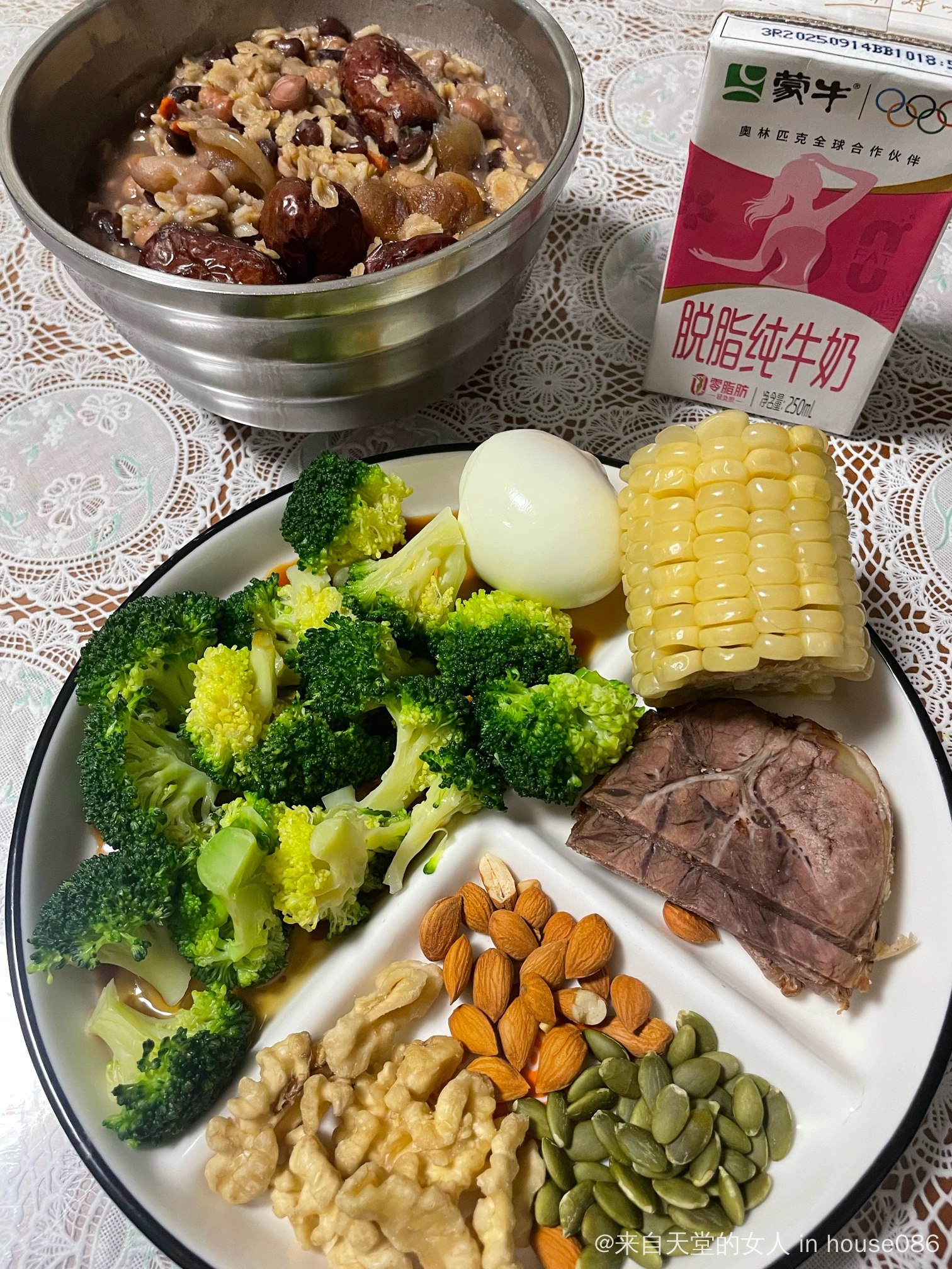 盘中:酱牛肉、鸡蛋、核桃仁、南瓜子、杏仁、橄榄油拌西兰花