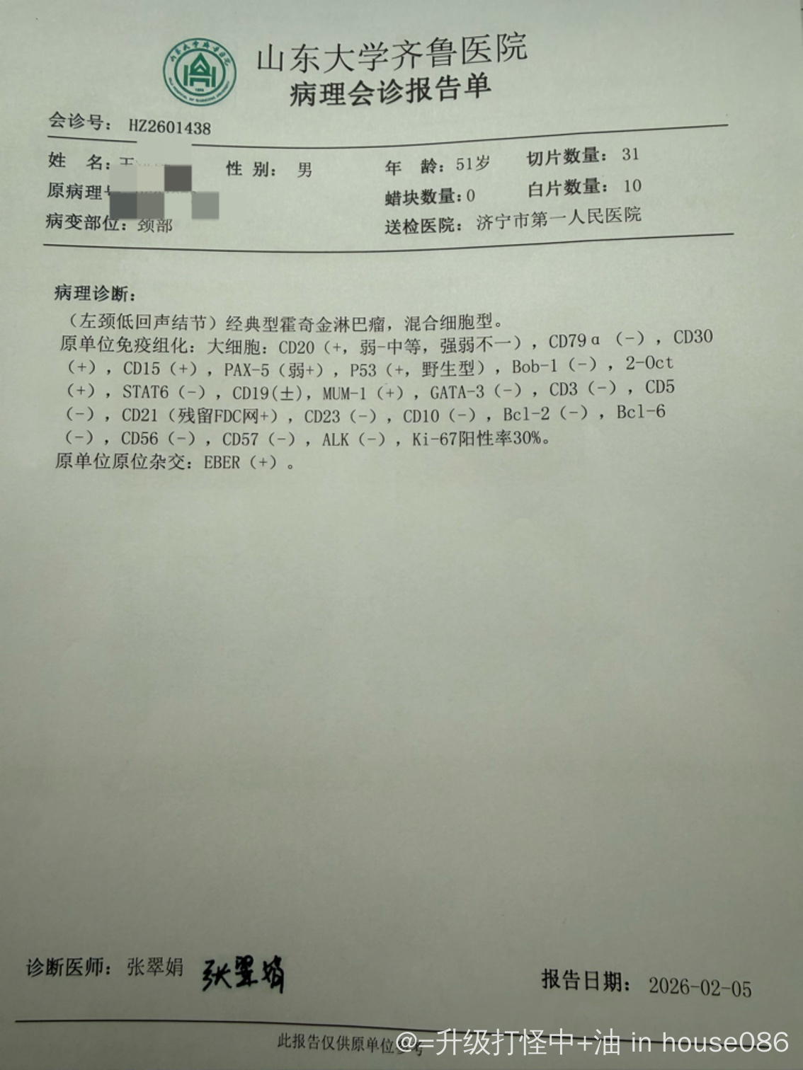 在当地医院会诊的还是考虑,借的切片去济南齐鲁医院会诊最终确认的