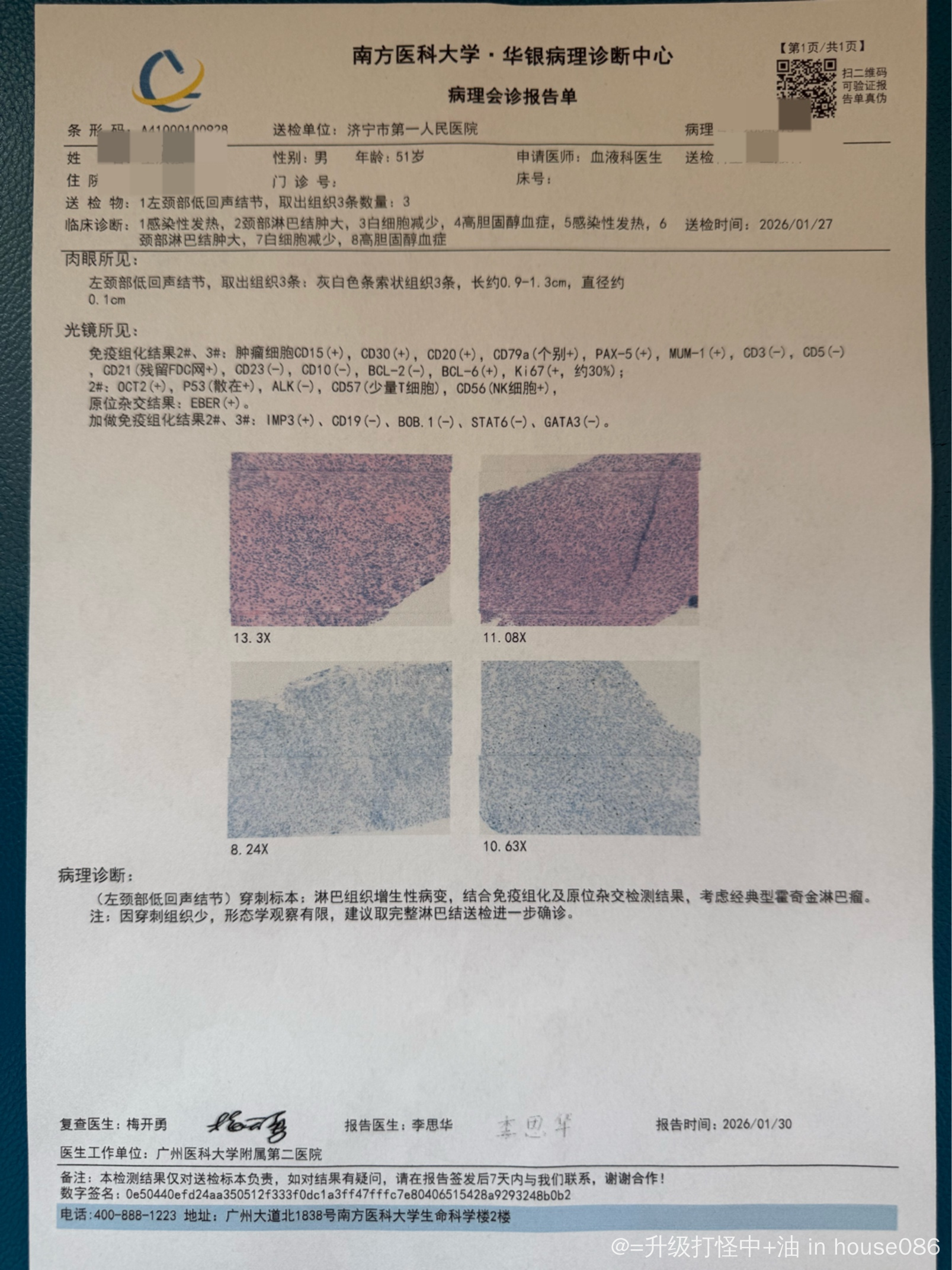 确诊霍奇金淋巴瘤混合细胞型IV期,B组,IPS评分4分,在济宁市人民医院已经进行了2次BV+AVD方案的治疗(当地医院用的吡柔比星+长春地辛+达卡巴嗪的方案),去齐鲁医院病理会诊才最终确定下来分型。