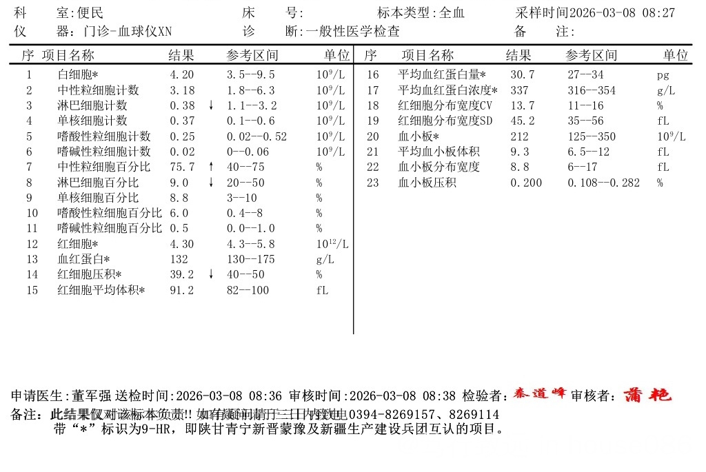 本次化疗后第7天,血常规化验总体感觉满意。这次到家后,虽然没出现上次返回后的红疹,但副作用感觉比上次严重的多,特别前3-4天恶心反胃(吐出的也不是东西都是粘液),便秘肠胃难受,贪睡睡不着,伴随着厌食体重也比回来轻7-8斤。继续努力,迎接半月后的再次战斗。