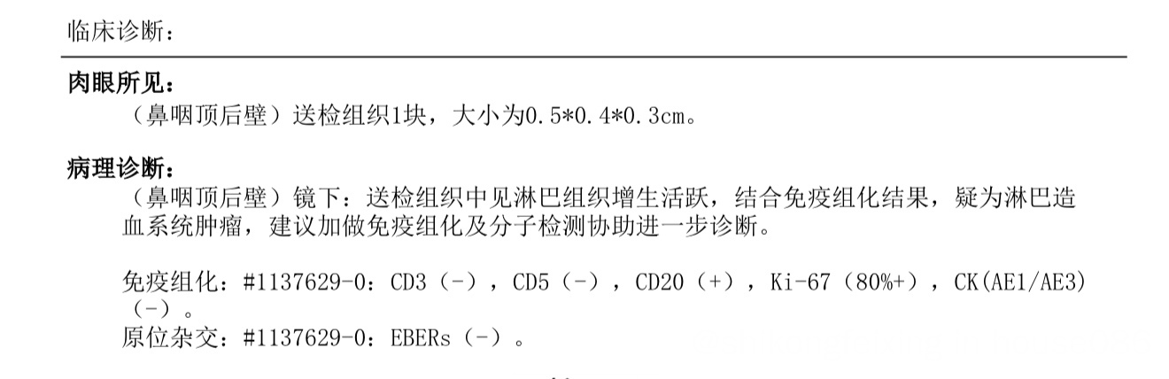 2019NKT 发表于 2025-10-18 17:51 我当时先在门诊局麻,取鼻腔的组织物,病理结果为良性,后来大夫建议住院全麻取深处的组织,病理结果才确诊为淋巴瘤nkt鼻型。你的报告里ki67为80%,说明恶性程度较高,等淋巴瘤分型确定后,尽快治疗。