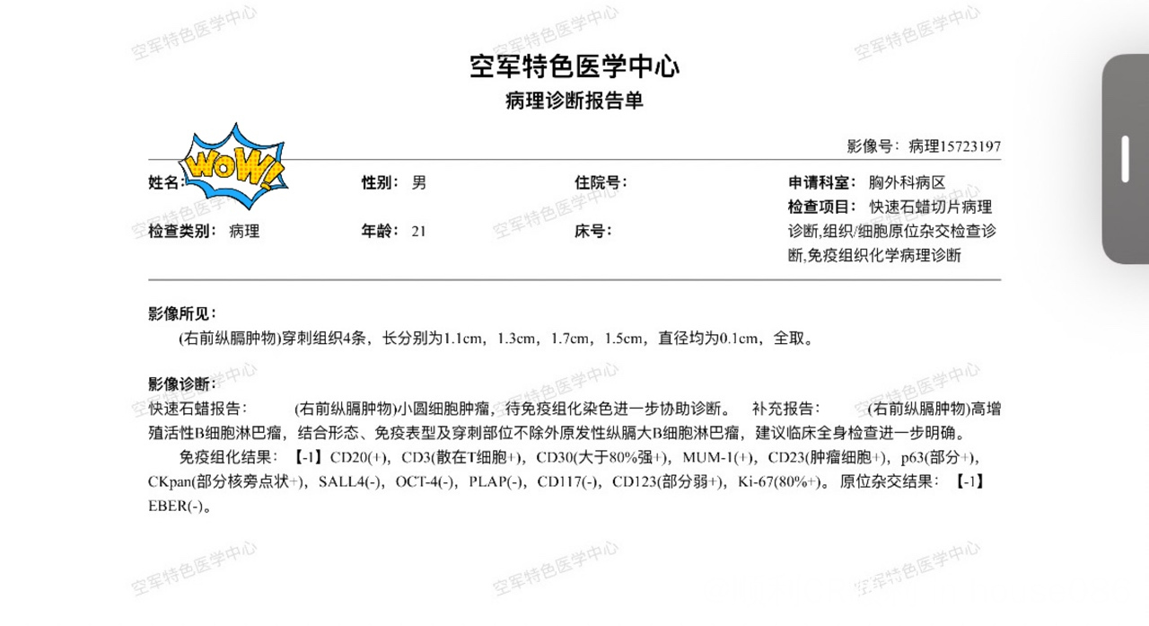 一大瓶营养快线 发表于 2025-10-19 16:26 纵膈上,从我们不专业的角度看,CD30已经表达很明显了,多半霍其金。但是为什么不查ALk,排查一下间变大呢
