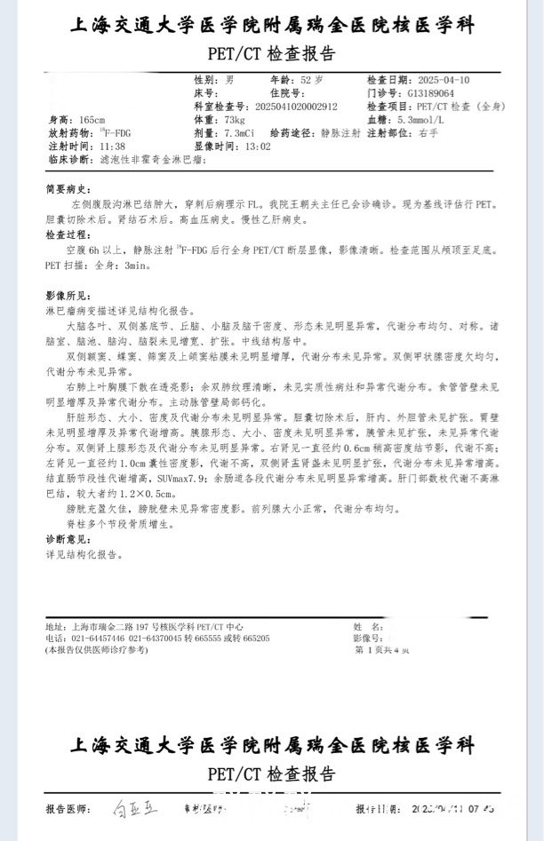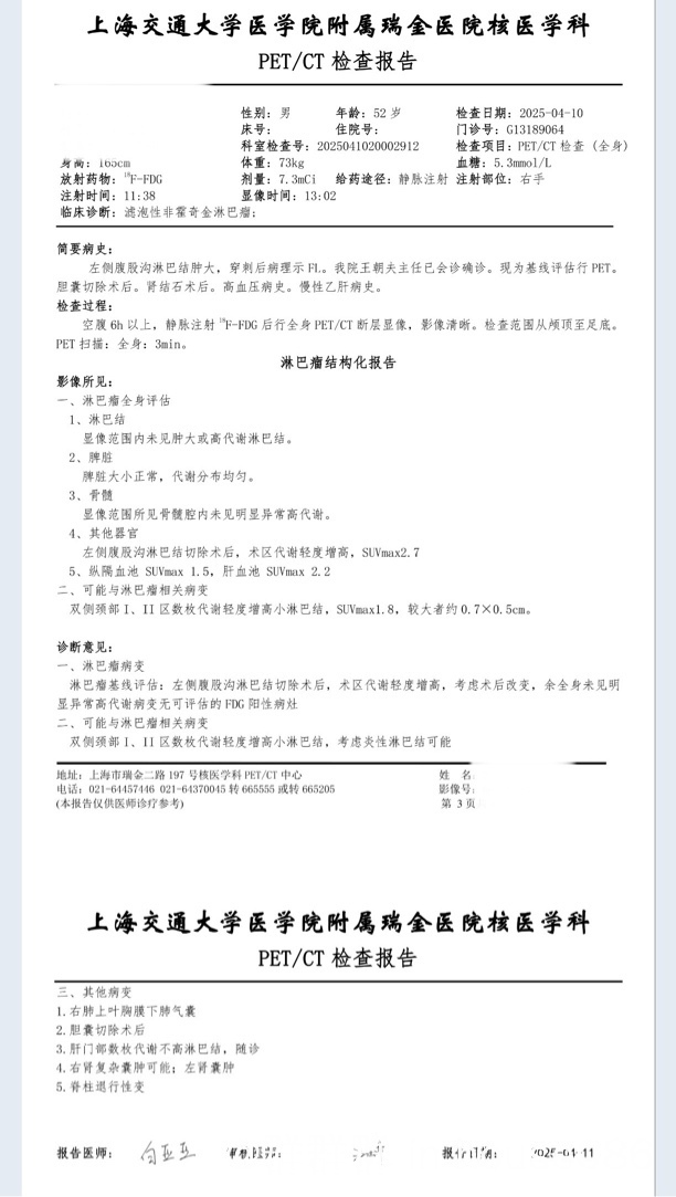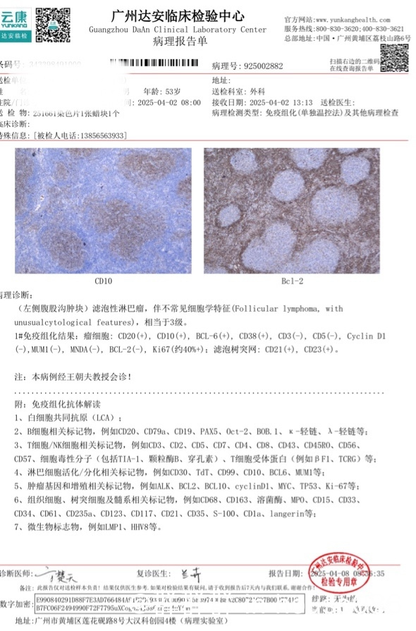 如果是弥漫性增长的FL(目前看可能比较大,因为表现符合,一个是发病位置局限在腹股沟,且表达cd23),如果是这一类型的,那么预后是比较好的,理论上切除了,后续做不做放疗或靶向都可以 |