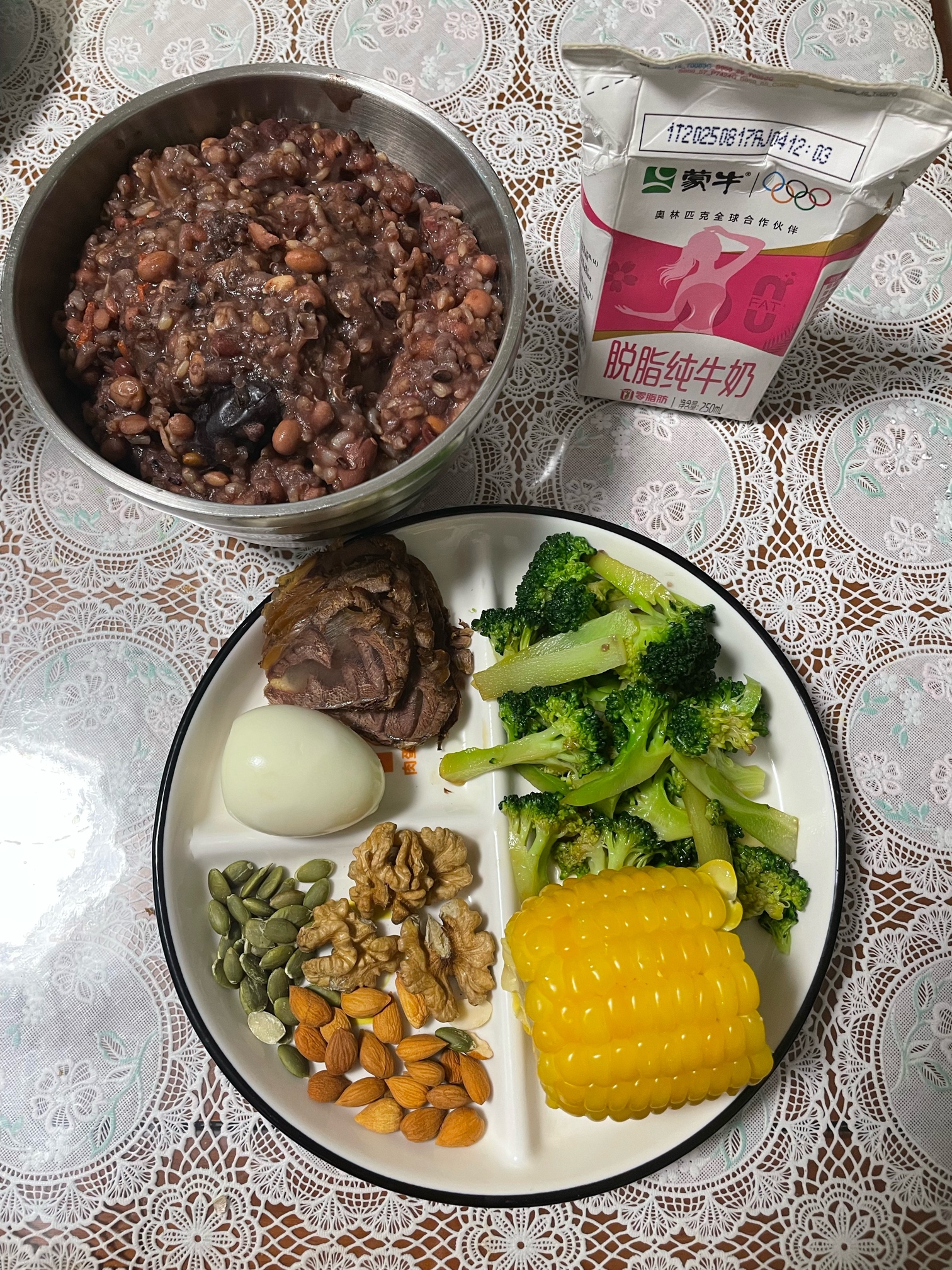 今日早餐:杂粮粥配牛肉、鸡蛋,搭玉米西兰花,再嚼点坚果配脱脂奶,营养全到位~好好吃饭攒足劲儿,咱们都要稳稳好好的!